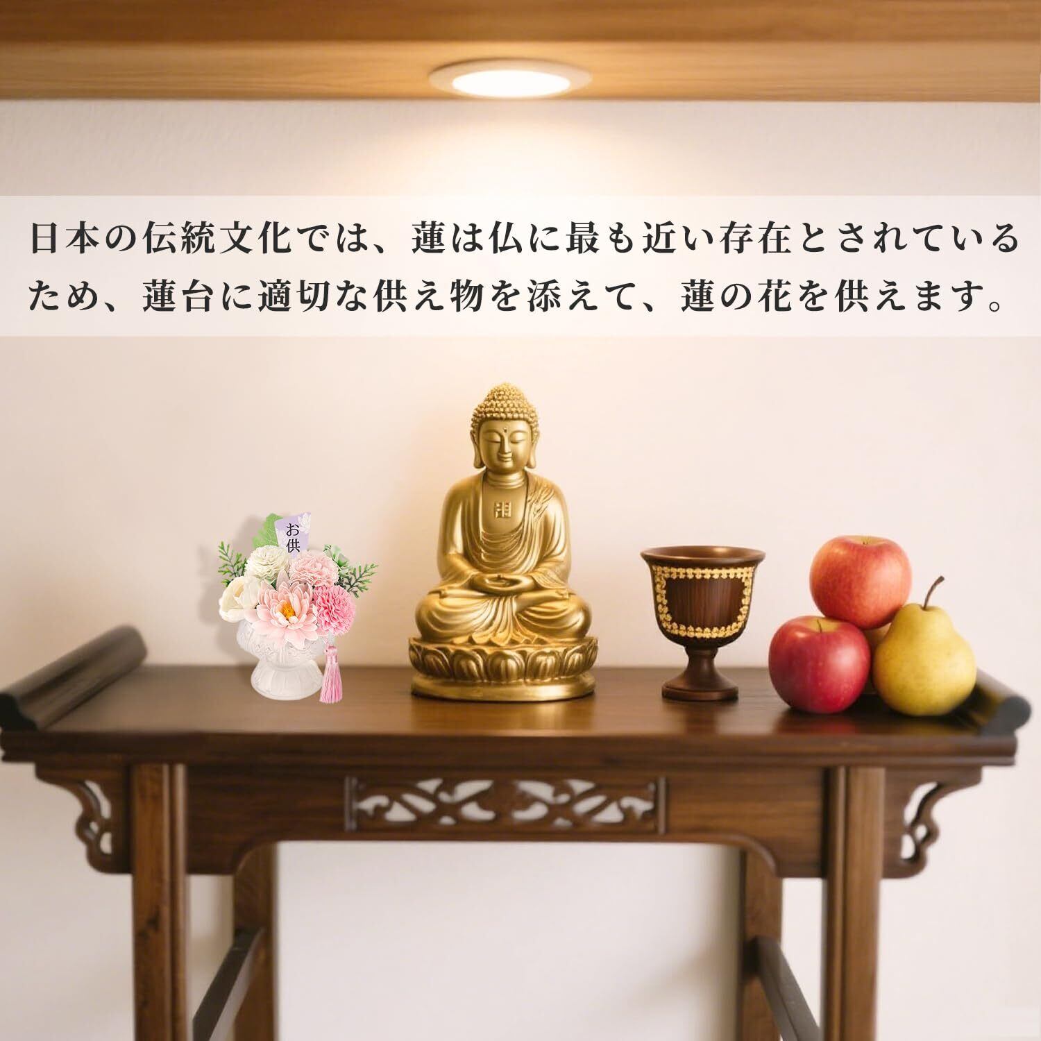 【枯れない仏花 供花でお手入れ不要】お彼岸でお墓や仏壇に花を飾るのは、仏教の逸話が関係しています。仏教には「お釈迦様が仏様に花をお供えした」という逸話が残っており、それに倣って花を供えるようになったとされています。お彼岸やお寺にお参りする日には、日本の伝統では菊を供え物として用います。日本の伝統文化では、蓮は仏に最も近い存在とされているため、蓮台に適切な供え物を添えて、蓮の花を供えます。
