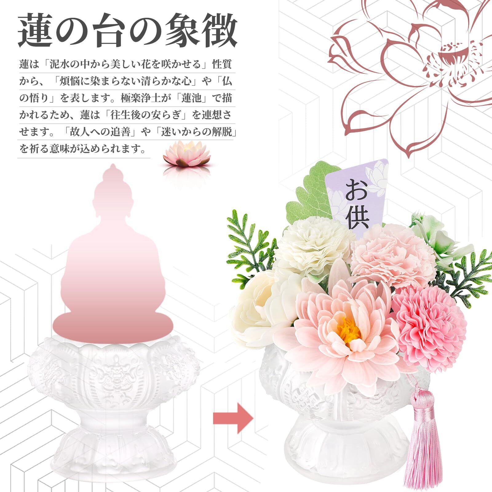 【材質と仕様】花の種類:キク、ヒノキ。神社建築にも使われる聖なる樹木とされ、その葉には「穢れを清める力」があると考えられています。祖先の霊を迎える場を清める役割があります。様々なものが多い仏壇の前でもすぐに飾りやすいサイズとなっております。花器:ガラス製の蓮の花瓶の台座。サイズ:直径13.5cmX高さ19cm(受皿とドームも含みます)。【お供】の札が付き。ガラスの透明感や光の反射が花の美しさを引き立て、目が付くたびに癒やされます。