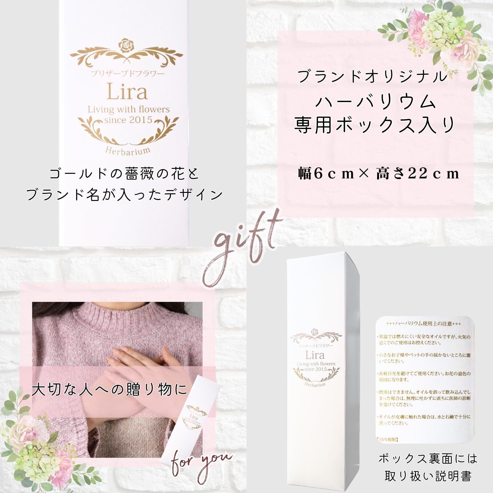 【プリザーブドフラワーLira】 高さ21.5㎝の円柱型の瓶にカスミ草とオイルが入ったハーバリウム(植物標本)です。造花は使用せず、本物のお花のみ使用しています。誕生日・母の日・敬老の日・退職祝いなどのギフト・プレゼントにご利用いただけます。場所を取らないスリムなスタイルですので、ご自宅用にもいかがでしょうか