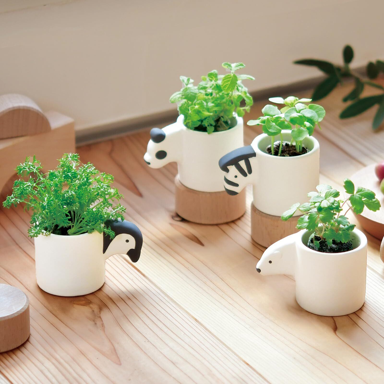 手のひらサイズの陶器製アニマルポットでハーブを育てます。