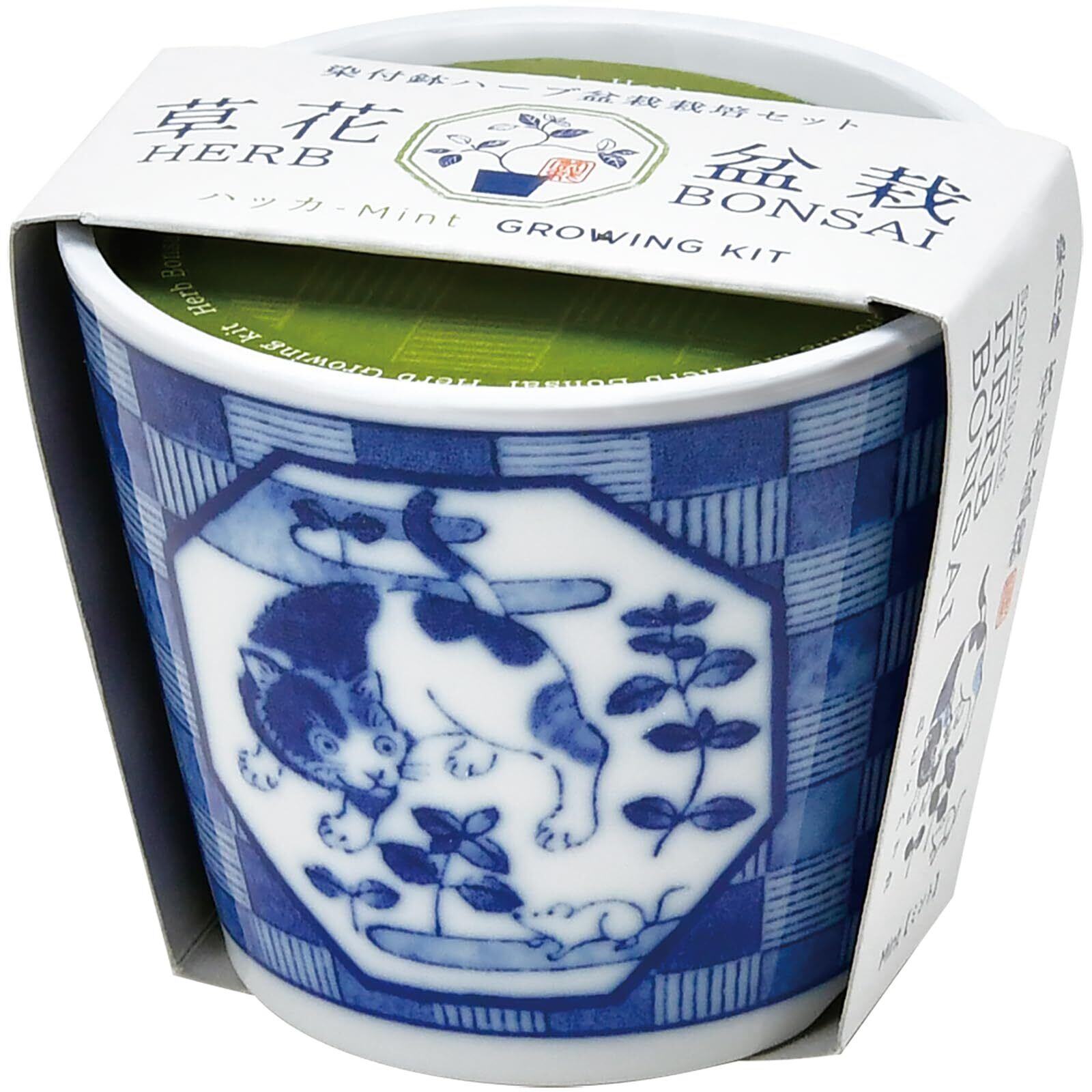 聖新陶芸 通年 家庭菜園 ミニ 簡単 ゆったり育てる 栽培キット ミント 香草 ハーブ 栽培セット (自由研究/食育) 鉢の径 約7cm 染付小紋 草花 BONSAI ネコ 母の日 プレゼント 誕生日 GD-102202