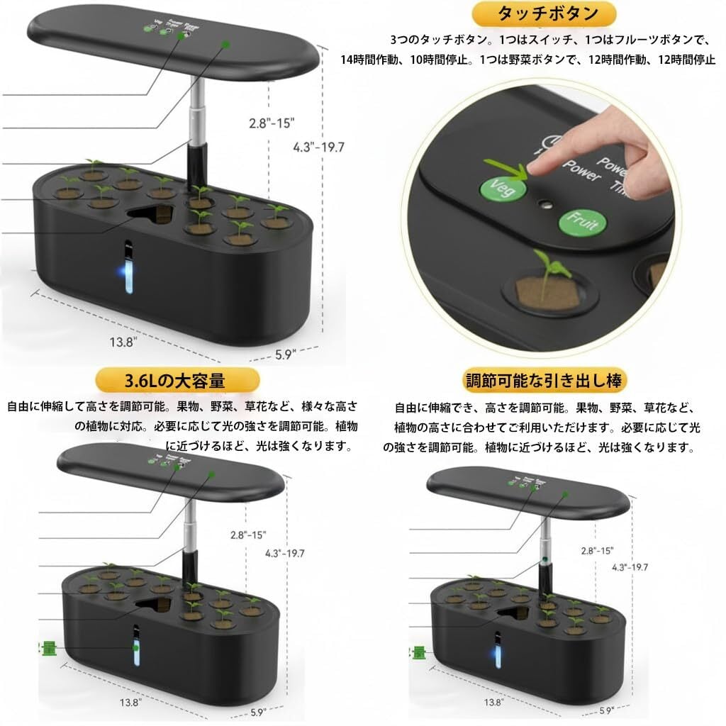 【3ボタンで簡単操作】野菜=赤白光、花果=赤青白光、タイマーは16h点灯/8h消灯。家庭菜園に便利な水耕栽培キット。