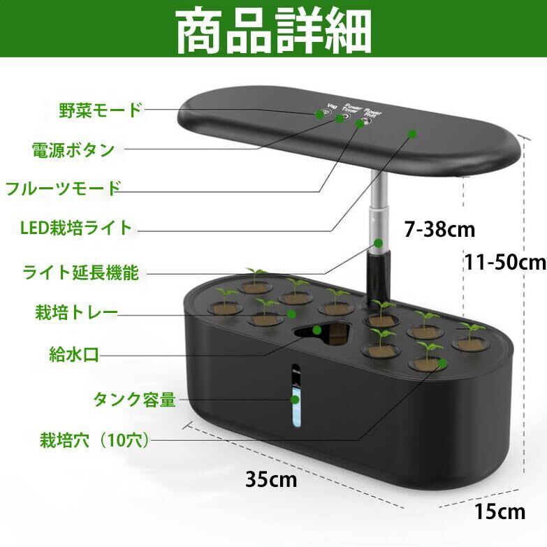 水耕栽培キット 室内家庭菜園 LEDライト付き 自動水循環システム 2段階栽培モード 高さ調整可能 10種類の野菜やハーブを同時に育てられる おしゃれな家庭菜園キット