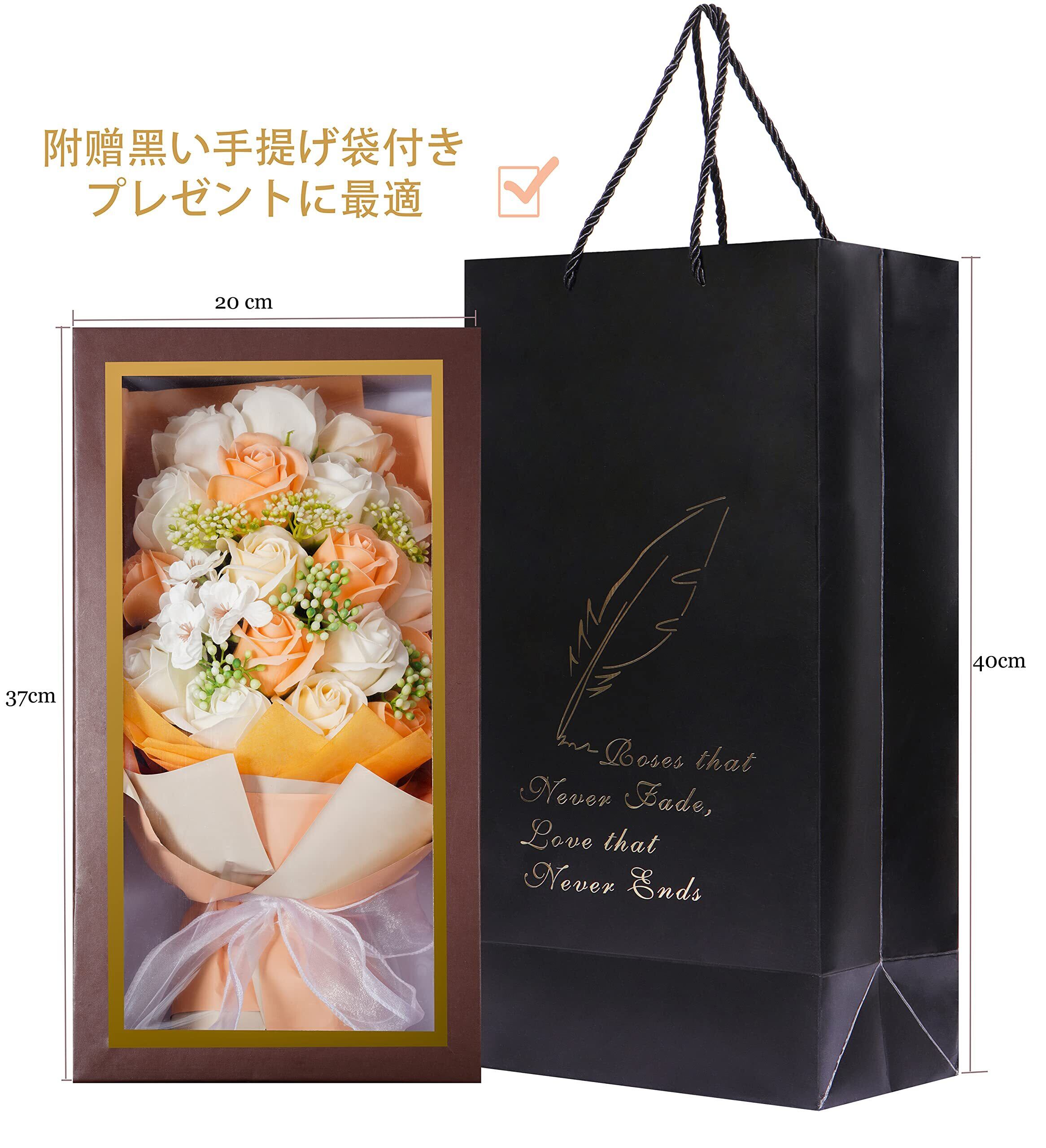 【黑い手提げ袋が付属します】ギフトBOX入りソープフラワーには、18本のアーティフィシャルローズが、花束サイズ:約32×16×9cm、総重量:約450g。高級感のある透明な金枠のデコレーションボックスサイズ:約37*20*12cm。 また、すぐにお渡しできるよう専用のギフトボックスをお付届け致します。ギフトとしての見栄えもばっちり,黒い手提げ袋サイズサイズ:約40*12.5*21cm,ギフトをより高級で貴重なものに見せてくれるため、どなたかへのプレゼントにも最適である。