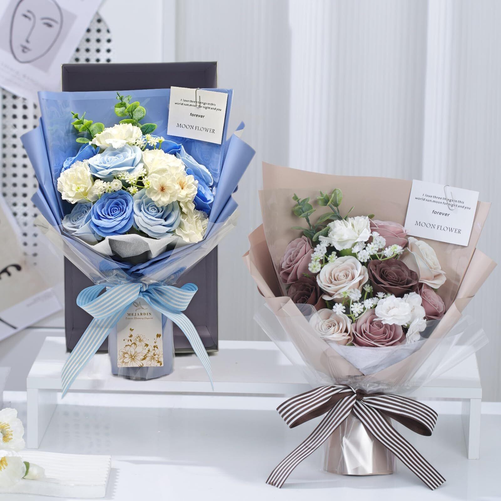 【製品特徴2】絶妙なギフトボックス包装、頑丈で耐久性があります。万が一、商品破損や花折れがある場合は、全商品品質保証対応しておりますので、御遠慮なくにご連絡ください。必ず最善を尽くします。贈られるお方はブーケを長期にエレガントな装飾品として部屋、客間などの場所に保存できます。