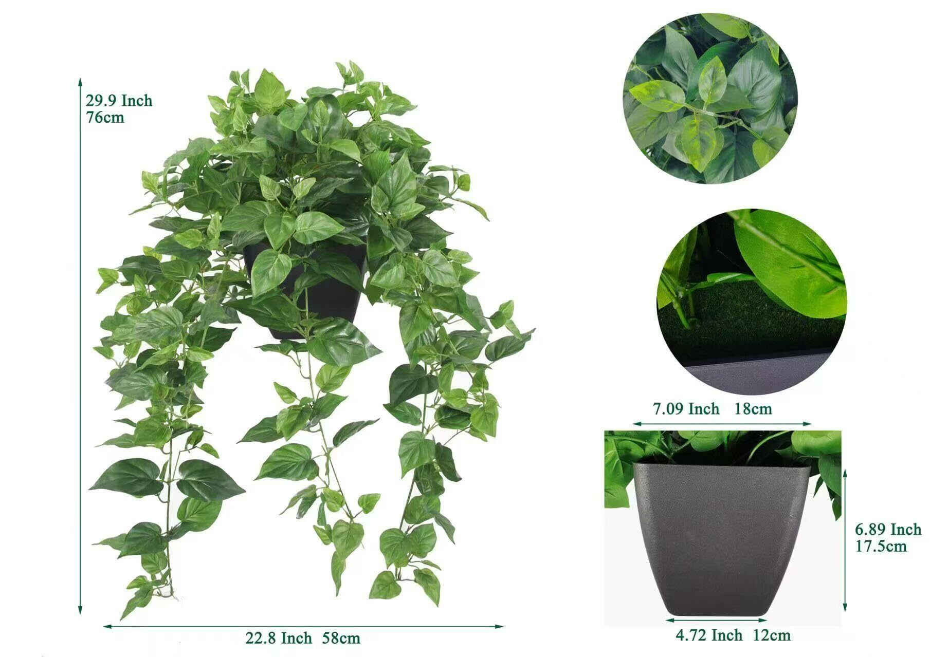 この見事な人工ポトスアイビー植物で屋内空間を変えましょう。メンテナンスなしで自然の豊かな美しさをご自宅にもたらします。 高さ30インチ、幅22.8インチの本物そっくりのシルク植物は、ハート型の葉がカスケードし、ドラマチックなトレーリング効果を生み出します。 リアルな葉は、洗練された現代的なブラックポットにあらかじめ配置されているので、組み立てる必要がなく、箱から出してすぐに飾ることができます。 緑が欲しい部屋、オフィス、スペースを明るくするのに最適です。この人工ポトスは、水やりをしたり剪定したりすることなく、一年中鮮やかな外観を維持します。 丁寧に作られた葉は、生きているポトスの自然な斑入りと質感を捉えています。また、後続のつるは、棚、マントルピース、吊り下げ式ディスプレイに奥行きと視覚的な興味を追加します。 このメンテナンス不要の装飾品は、本物の植物の時間を費やすことなく、永続的な植物の美しさを求める人にとって理想的なソリューションです。 ほこりっぽい水拭き。