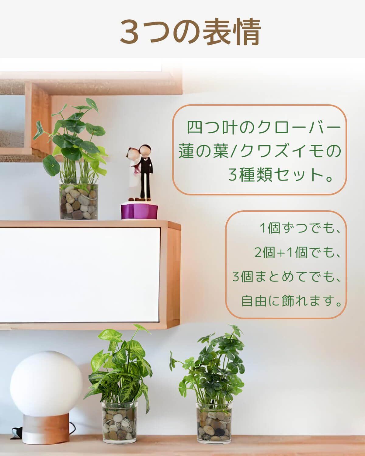 3種類の組み合わせで自由にアレンジ: 四つ叶のクローバー/蓮の葉/クワズイモの3点セット。1個ずつ置くのも、2個+1個で並べるのも、3個まとめて置くのも自由自在。届いたその日から、複数の場所で華やかな空間演出が可能です。
