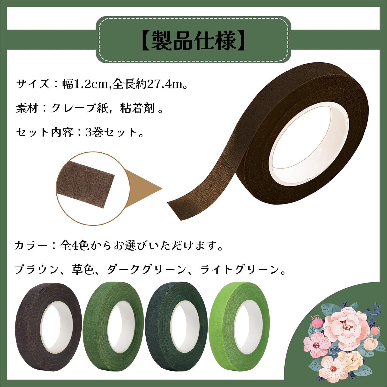 【製品内容】 幅1.2cm×長さ約27.4mのテープが3巻セット。4色から選択可能で,軽量で適度な強度があり,花束の固定や装飾に十分な分量です。