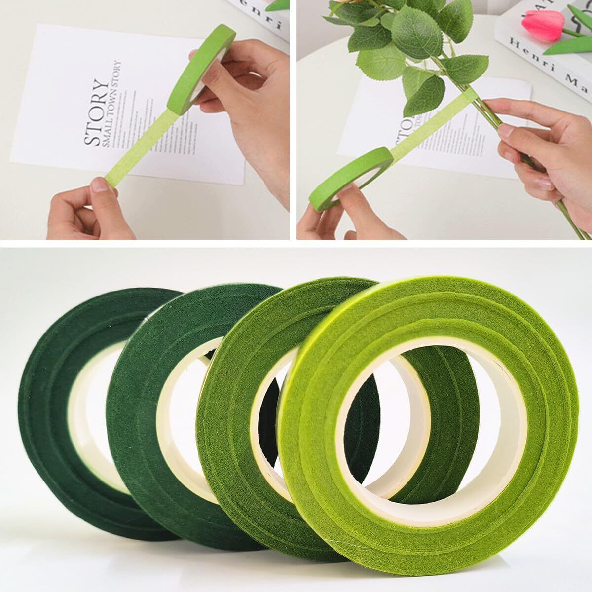 【不思議な花屋テープ】 グリーン系の花茎テープ4巻が届きます。各ボリュームの幅は12 mm、全長は30ヤードで、さまざまなプロセスニーズに対応できます。使用前に軽くストレッチして粘性を活性化します。
