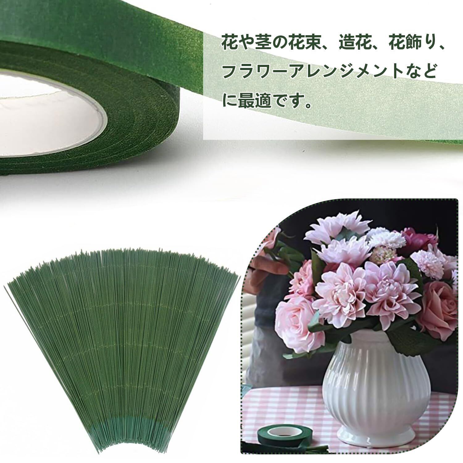 【キット内容】アーティフィシャル・ワイヤー・フラワーポール、50本セット、長さ20cm、太さ2mm、グリーンのフローラルテープ。