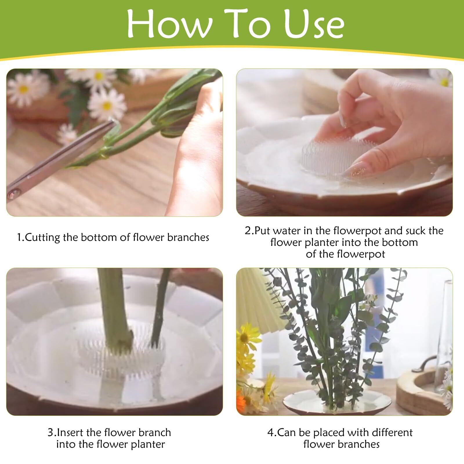 強力吸盤:剣山の裏面に吸盤が付いていますので、花器の滑らかな表面にしっかりと固定することができます。使用前に表面を乾かしてください。花瓶に水を入れた後、水圧により吸盤がよりしっかりと固定されます。