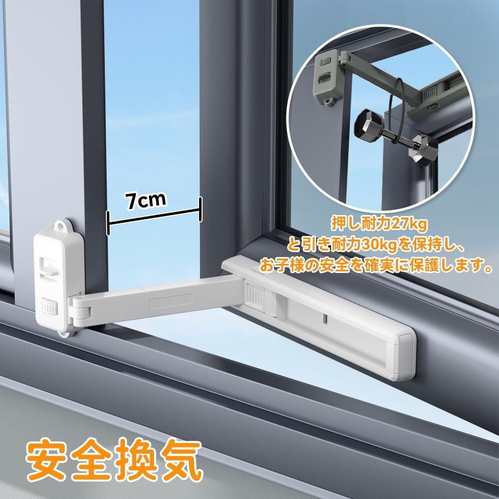 安全換気 最大開口幅7cmに制限します。押し耐力27kg・引き耐力30kgを保持し、お子様の安全を確実にガードできます。ペットの脱走にも効果的です。