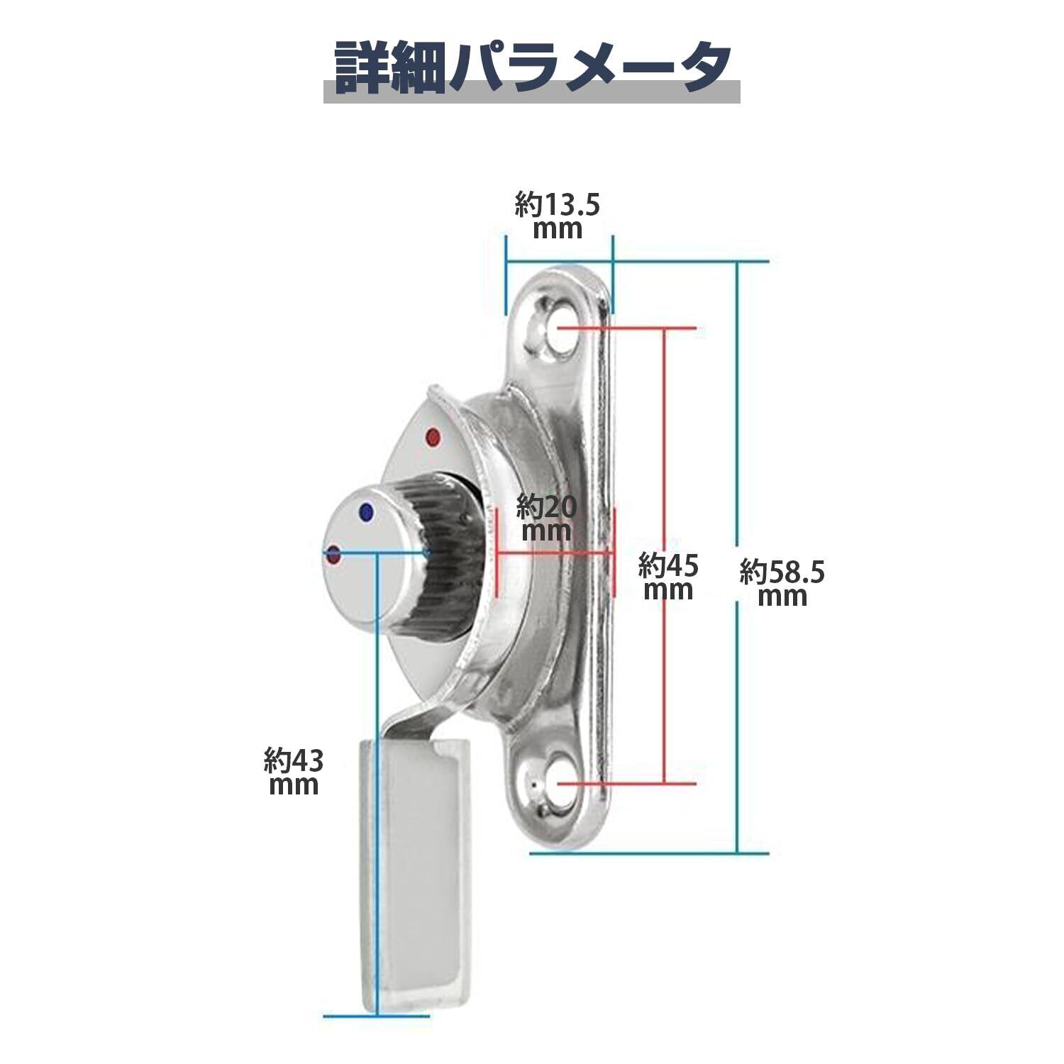 【製品詳細】この窓用ロックの取り付けネジの中心穴の間隔は約45mmで、底面からターンテーブルの中央までの高さは約20mmです。お買い物をお楽しみいただくために、商品のサイズが合っていることをご確認ください。