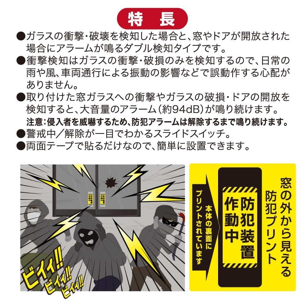 【 特 長 】 ◆ 取り付けた窓ガラスへの衝撃や破損・ドアの開放を検知すると、大音量のアラーム(約94dB)が鳴り続けます。(注:侵入者を威嚇するため、防犯アラームは解除するまで鳴り続けます。) ◆ 衝撃検知はガラスの衝撃・破損のみを検知するので、日常の雨や風、車両通行による振動の影響などで誤動作する心配がありません。 ◆ 警戒中/解除が一目でわかるスライドスイッチ付きです。 ◆ 両面テープで貼るだけなので、簡単に設置できます。 ◆ 本体の裏面にプリントされた「防犯装置作動中」、窓の外から見えます。 ◆ カラーはブラック ◆ 2個セット【 仕 様 】 ◆ 検知方式:衝撃+開放検知式 ◆ 電源:コイン形リチウム電池CR2032×1個(別売) ◆ 電池寿命:連続吹鳴時間…約3時間、待機のみの場合…約18か月 ◆ 音量:約94dB (50cm離れた所を測定) ◆ 本体サイズ:(約)高さ93×幅34×奥行9mm ◆ 重量:本体…約19g(電池を含まない)、マグネット…約7g ◆ 使用温度範囲:-20°C~60°C(屋内専用) ◆ 付属品:取扱説明書