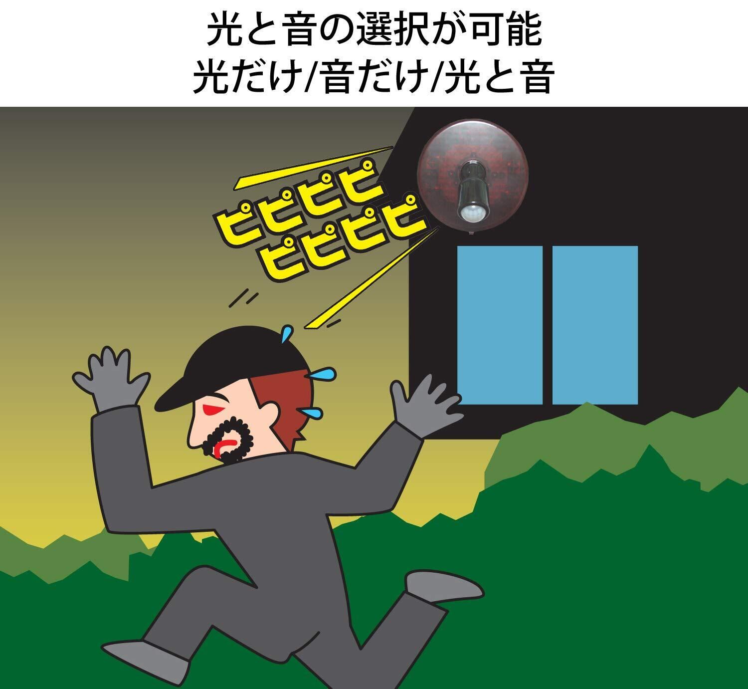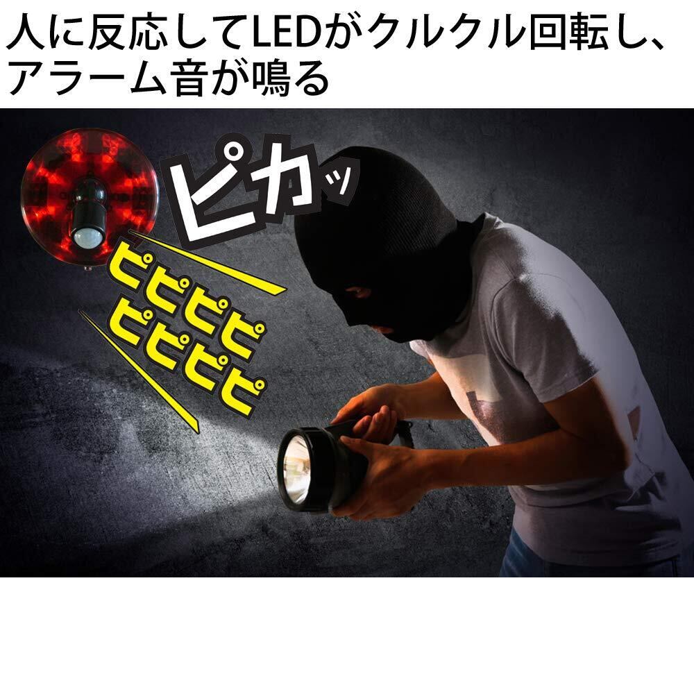 人の動きを感知すると、赤いLEDが回転または点滅し、アラーム音が15秒警告します。