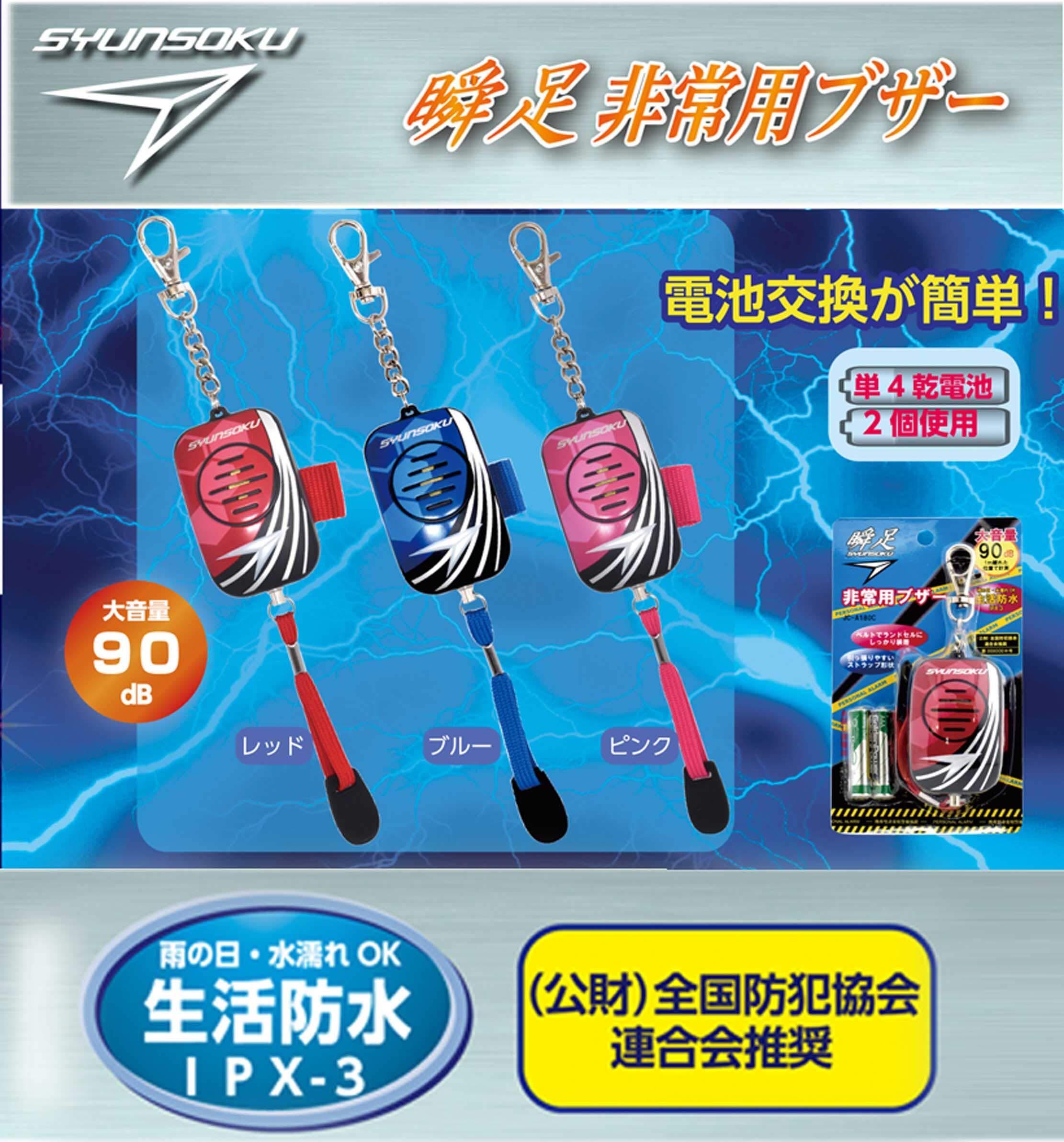 【特長】ベルト付きでランドセルにしっかりとめられる瞬足の防犯ブザー