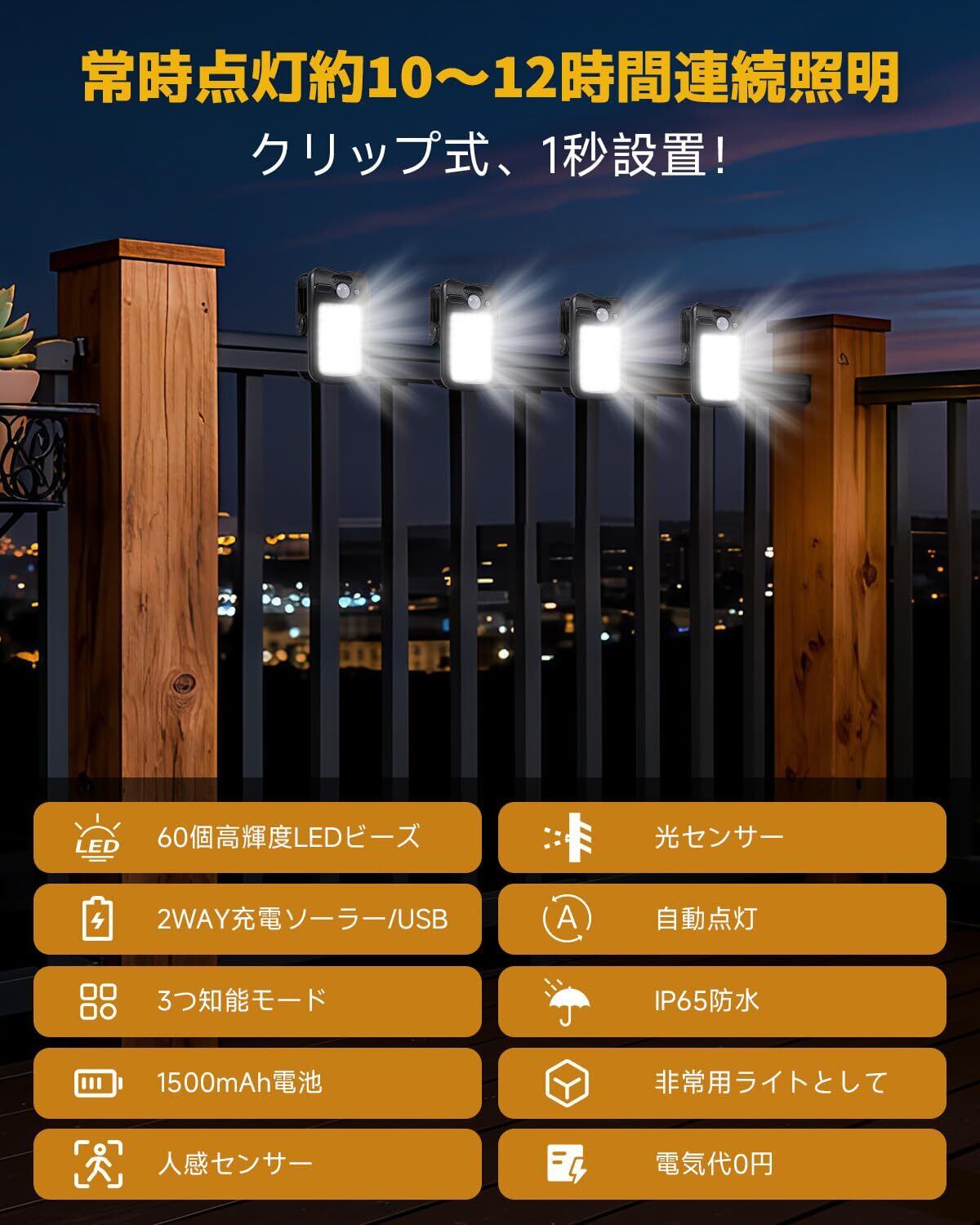 ソーラーライト 屋外 クリップ USB充電式 センサーライト ソーラー 60LED 3つ知能モード 人感センサー IP65防水 太陽光発電 自動点灯 ガーデンライト クリップライト 庭先/表玄関/駐車場/柵/フェンス/キャンプ 設置簡単 防災対策 防犯ライト 昼白色 2個セット
