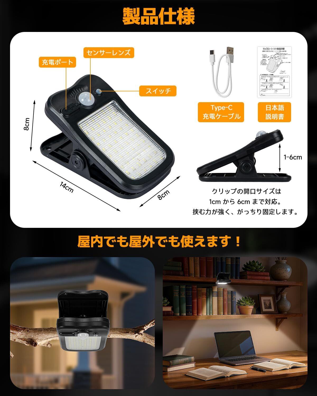 【クリップ式、1秒設置】クリップのように挟むだけの超簡単設置。工具いらず、壁穴あけなし、粘着テープももう不要。女性やご年配の方にもぴったりの、らくらく設置ソーラーセンサーライトです!60個高品質LEDが揃え、発光効率の高い上に、発熱が少なく、低赤外線・低紫外線で虫を寄せ付けにくい。色温度は6500K、明るい白色の光が周囲に広がります。人感センサーライトの検出角度が120°になったので、ほぼすべての角度から不審者や犯罪者を威嚇できます。屋外に設置して防犯対策効果が抜群です。(設置前に、できるだけ日当たりの良い場所を選んでください)