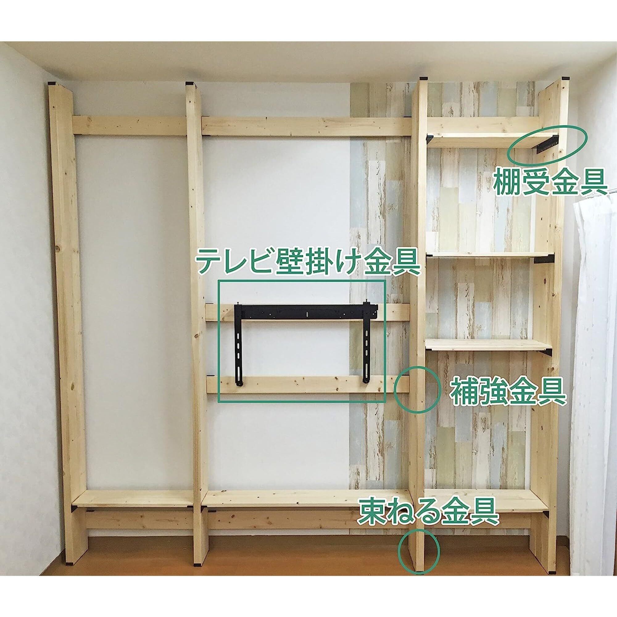 ツーバイ材、ワンバイ材を3連結→棚板/ツーバイ材を3連結→支柱 として使う金具