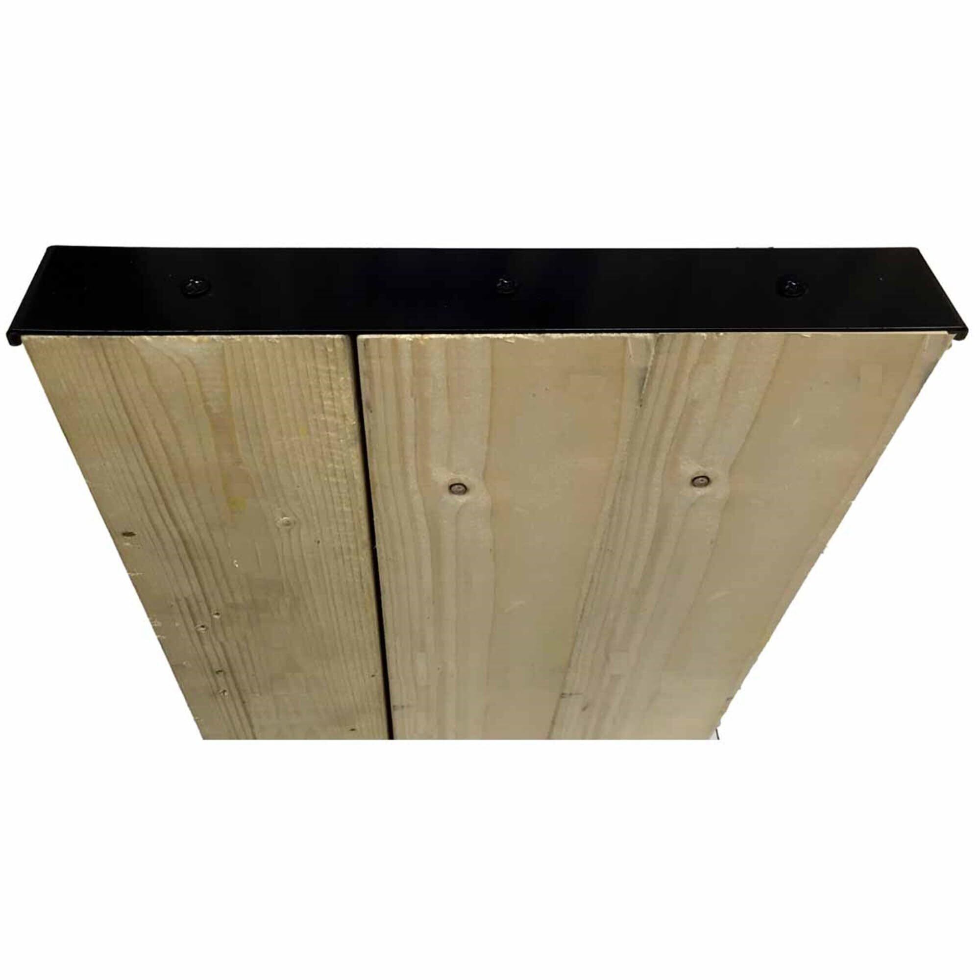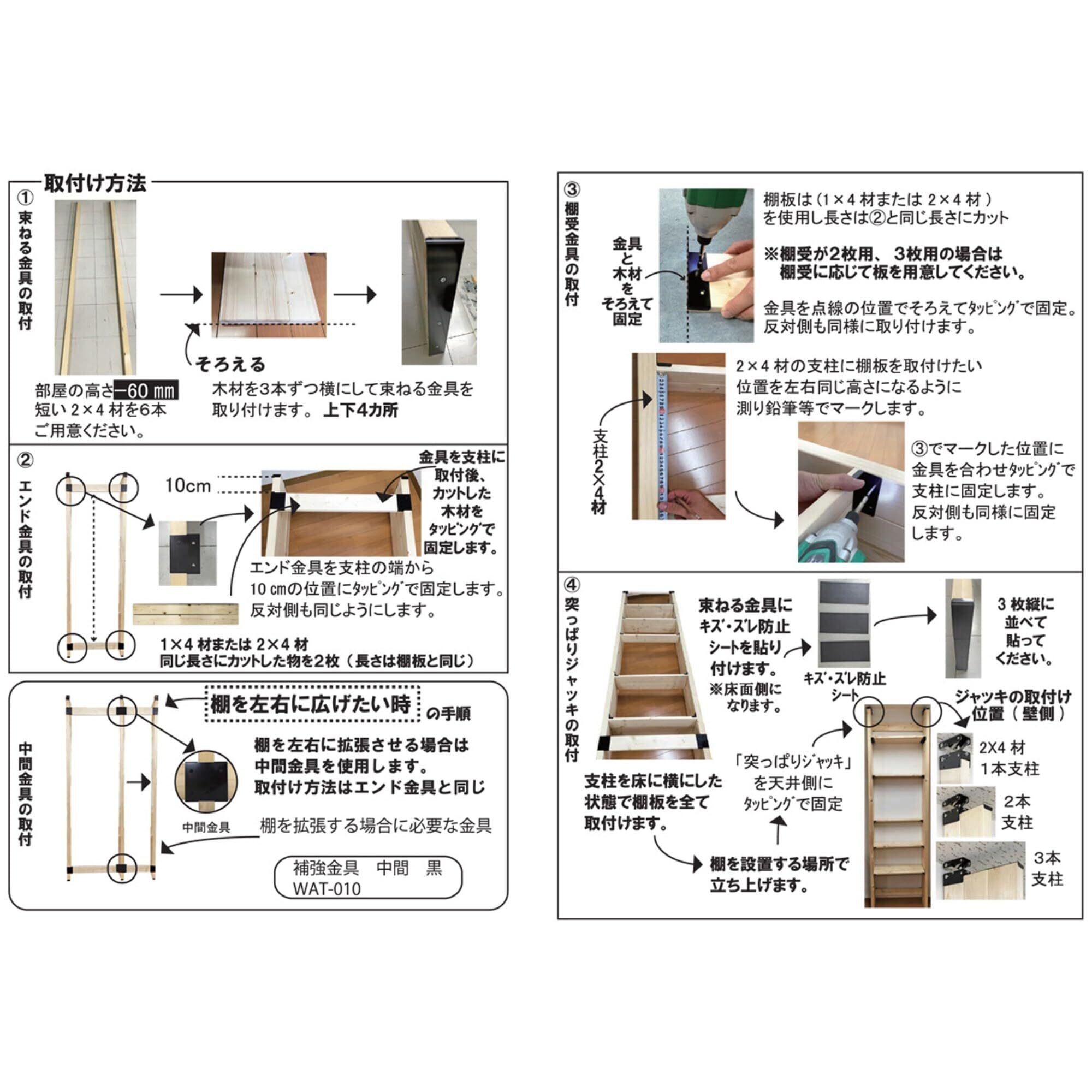「1X4」材または「2X4」材を3連結→棚板、「2X4」材を3連結→支柱として使う金具です