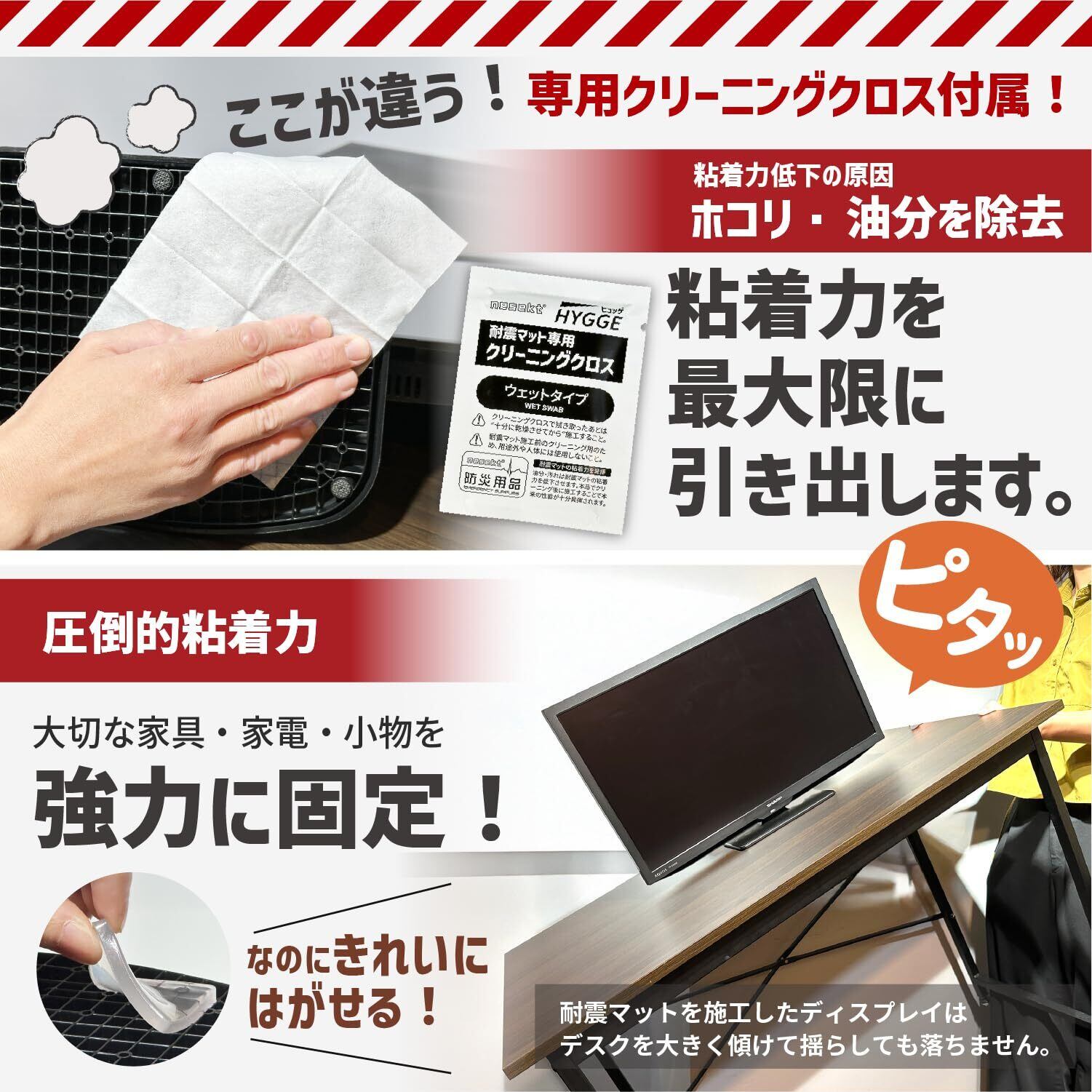 【強力粘着を実現する専用クリーニングシート付属】耐震ジェルの実証試験を1年以上にわたり繰り返しましたが、安定した耐震性能の実現には「強力粘着」が非常に重要でした。しかしほこりや油分がある面に貼付をすると大幅に粘着力は低下します。そこでクリーニング性能を最適化した専用のクリーニングクロスを製品に付属しました。貼付前にご使用いただくことで100%の粘着力をかんたんに実現することができます。