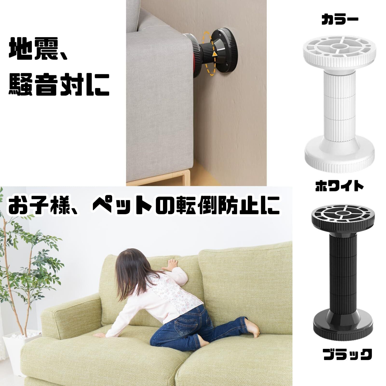 【使用方法】サイズは6種類、間のパーツの数を変えることで長さの調整が可能且つ廻して微調整も可能です。付属の強力な粘着力の両面テープを両端に付け、家具と壁を固定します。