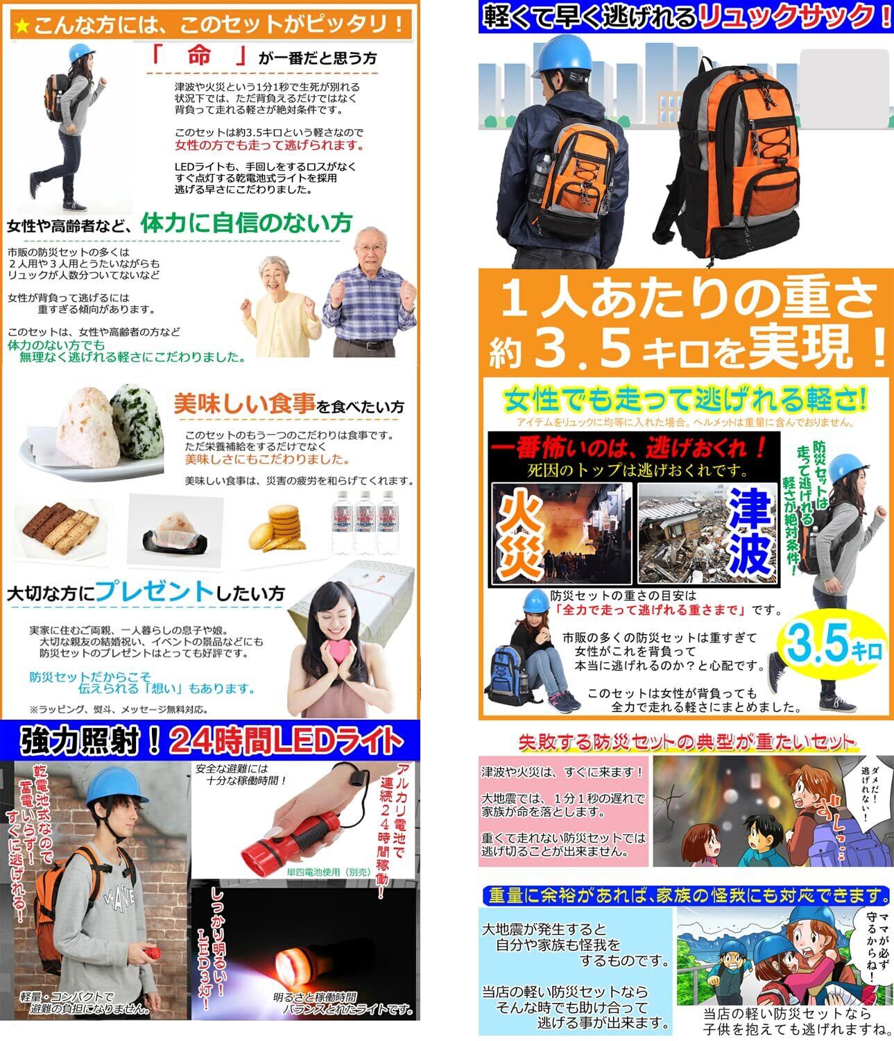 リュックサック、保存水、マジックライス、バランスパワー、生命のパン、ビスケット、LEDライト、レインコート、防煙フード、防寒シート、簡易トイレ、ラジオ、軍… 表示を増やす