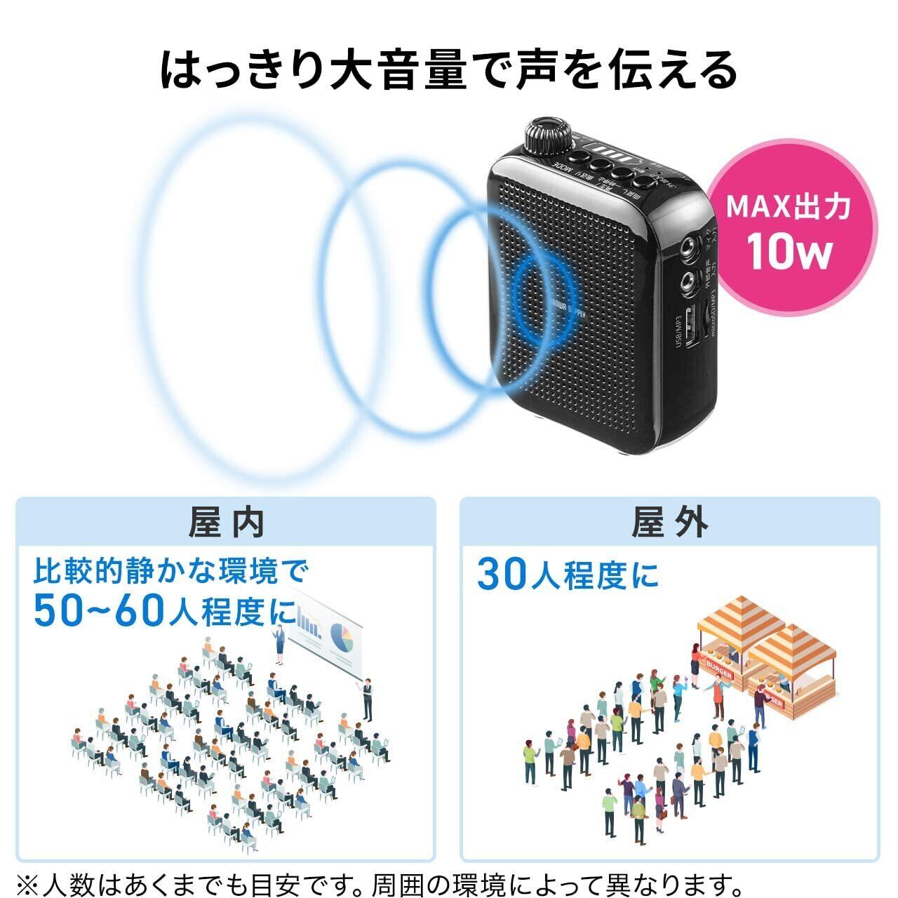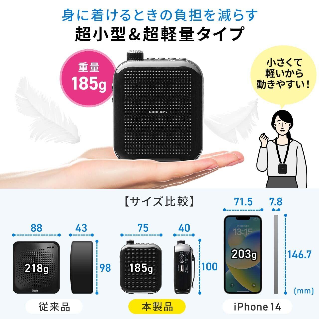 【2022最新】サンワダイレクト ポータブル拡声器 ハンズフリー 拡声器 10W 小型 軽量185g 音楽再生可能 充電式 1個 400-SP105