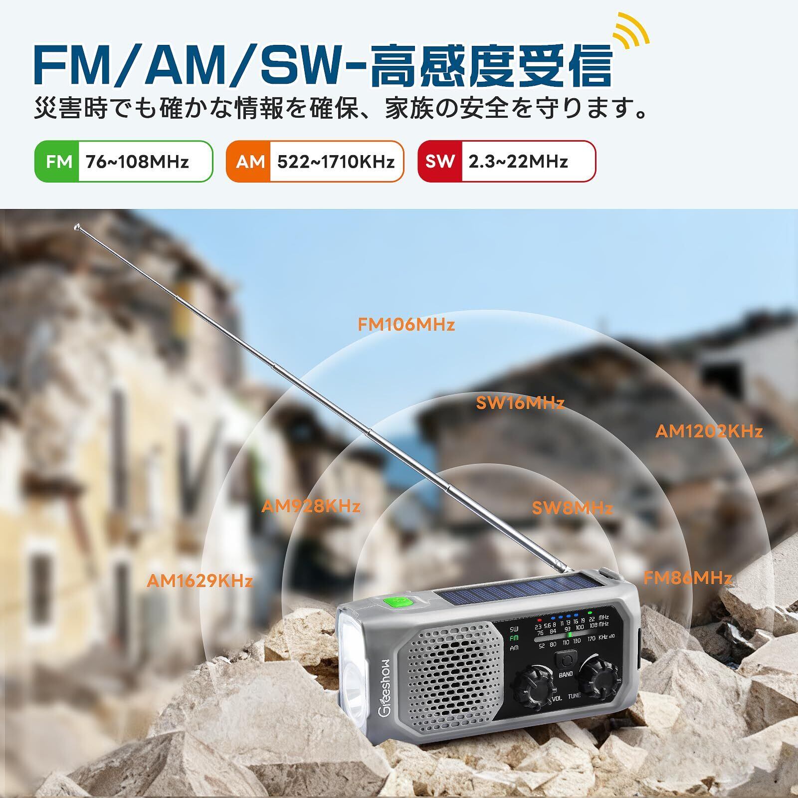 【いざという時の強い味方】Greeshow防災ラジオ GS-298は、FM(76~108MHz)・AM(522~1710KHz)・SW(2.3~22MHz)の3バンドをカバーする広帯域受信に加え、伸縮式アンテナで災害時にも強力な感度を発揮。停電やネットワーク不通時でも、確実に情報をキャッチし、あなたとご家族の安全を守ります。操作は各機能ごとに独立したボタンでお年寄りからお子様まで、ご家族全員が安心してご利用いただけます。さらに、3.5mmイヤホンジャックで周囲を気にせず情報に集中できます。防災備蓄の必需品としてだけでなく、日々の生活に寄り添う、温もりある一品です。