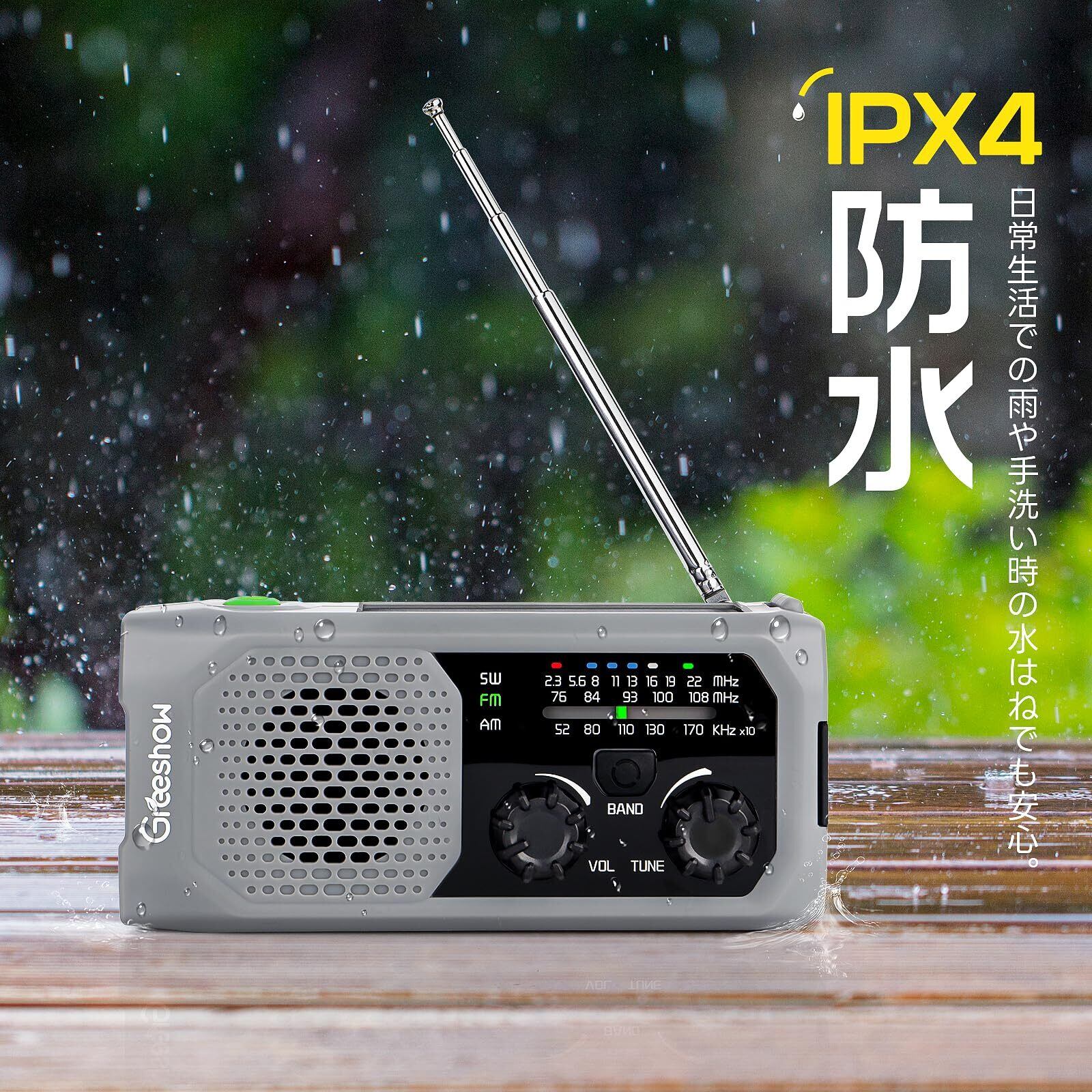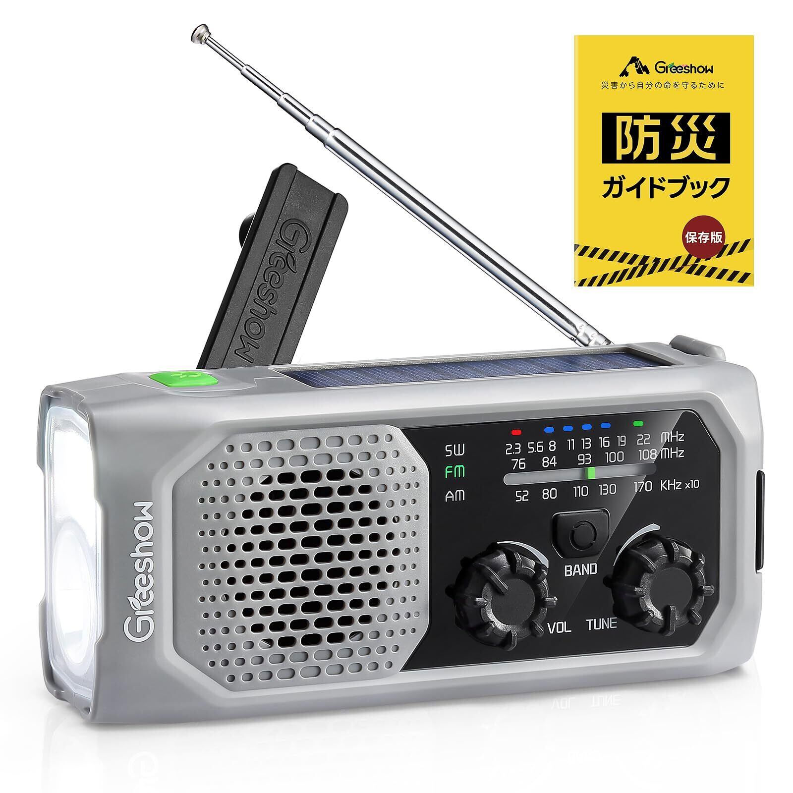 【2025年新モデル】Greeshow 防災ラジオ 多機能 手回しラジオ FM/AM/SW対応 ソーラー/USB充電 スマホ急速充電 IPX4防水 3.5mmイヤホンジャック付き 防災士推奨 懐中電灯 SOSサイレン 緊急災害対策 非常用 キャンプ ポータブルラジオ PSE認証済み 防災ガイドブック付き グレー GS-298