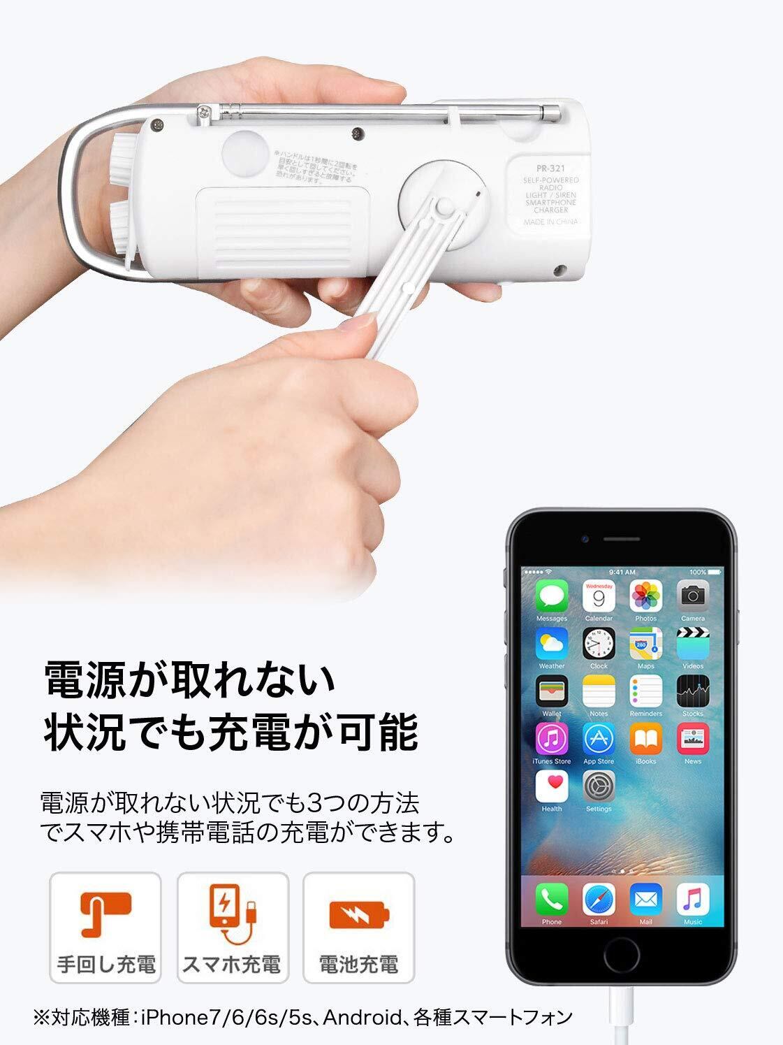 ・電池が無くても、手回し充電でスマートフォンや携帯電話が充電可能です。