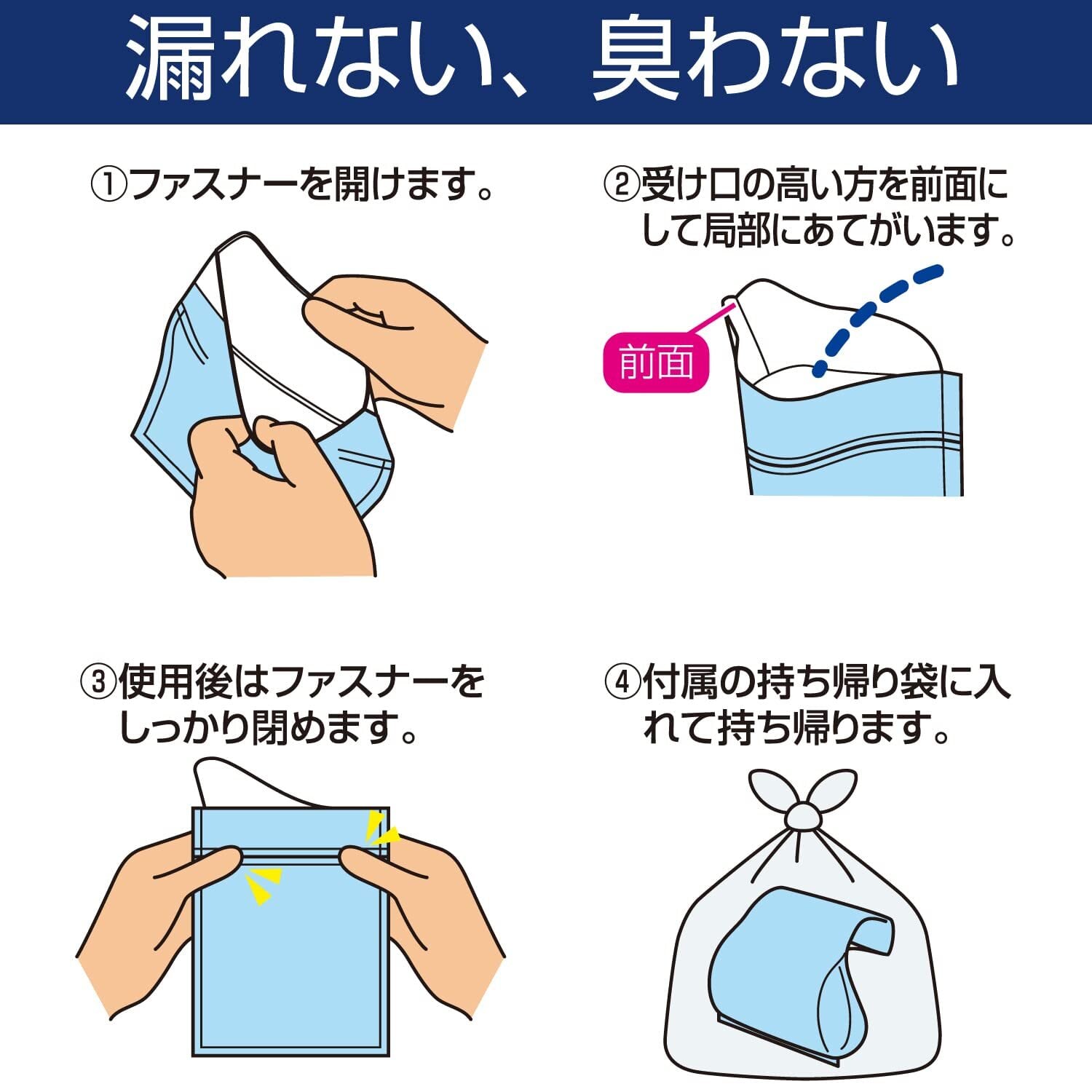 ■使用時のはずかしさを軽減する前掛けシート(1枚)と使用後の廃棄に便利な持ち帰り袋(3枚)を付属しています。