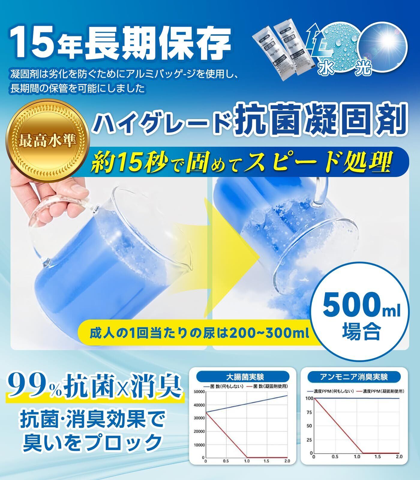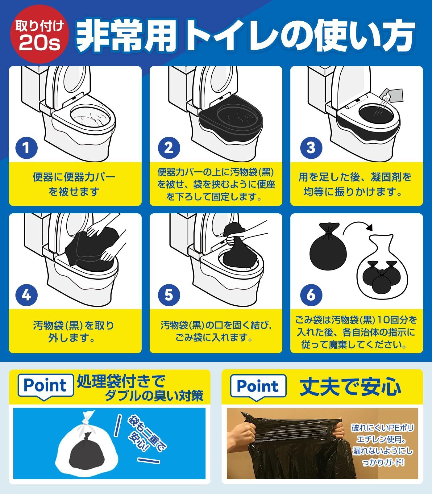 「プロ級の非常用トイレ凝固剤&備蓄に最適!」"吸水性・消臭性・抗菌性の3大機能を兼ね備えた高性能タイプの非常用トイレです。アルミ製パッケージで湿気を遮断し、15年の長期保存が可能となっています。10gの大容量凝固剤が排泄物を確実に固化します。厚手の防臭二重袋で臭い漏れを完全にブロックします。 通常品と比較して3倍の防潮性と2倍の凝固速度を実現しており、災害時でも衛生的にご使用いただけます。"