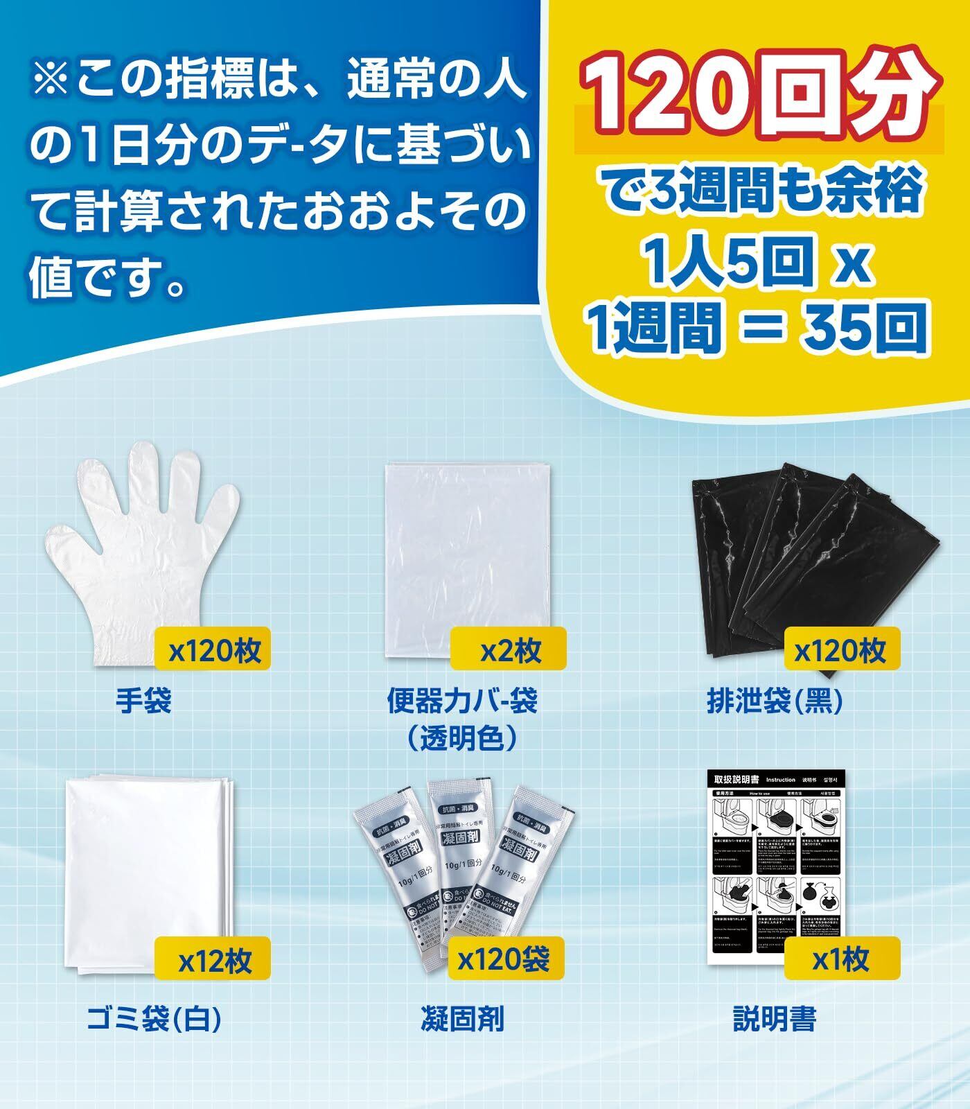 「60回&120回の2種類展開」"一人暮らしの方には60回分(1週間以上分)、ご家族には120回分(3人で1週間分)と、ライフスタイルに合わせて選べる非常用トイレセットです。コンパクト設計で引き出しやクローゼットのわずかなスペースにも収納可能です。災害時のトイレ確保は最優先課題だからこそ、場所を取らずにしっかり備えられるのが特長となっています。(※1人1日5回使用×7日=35回を目安に計算しています)"