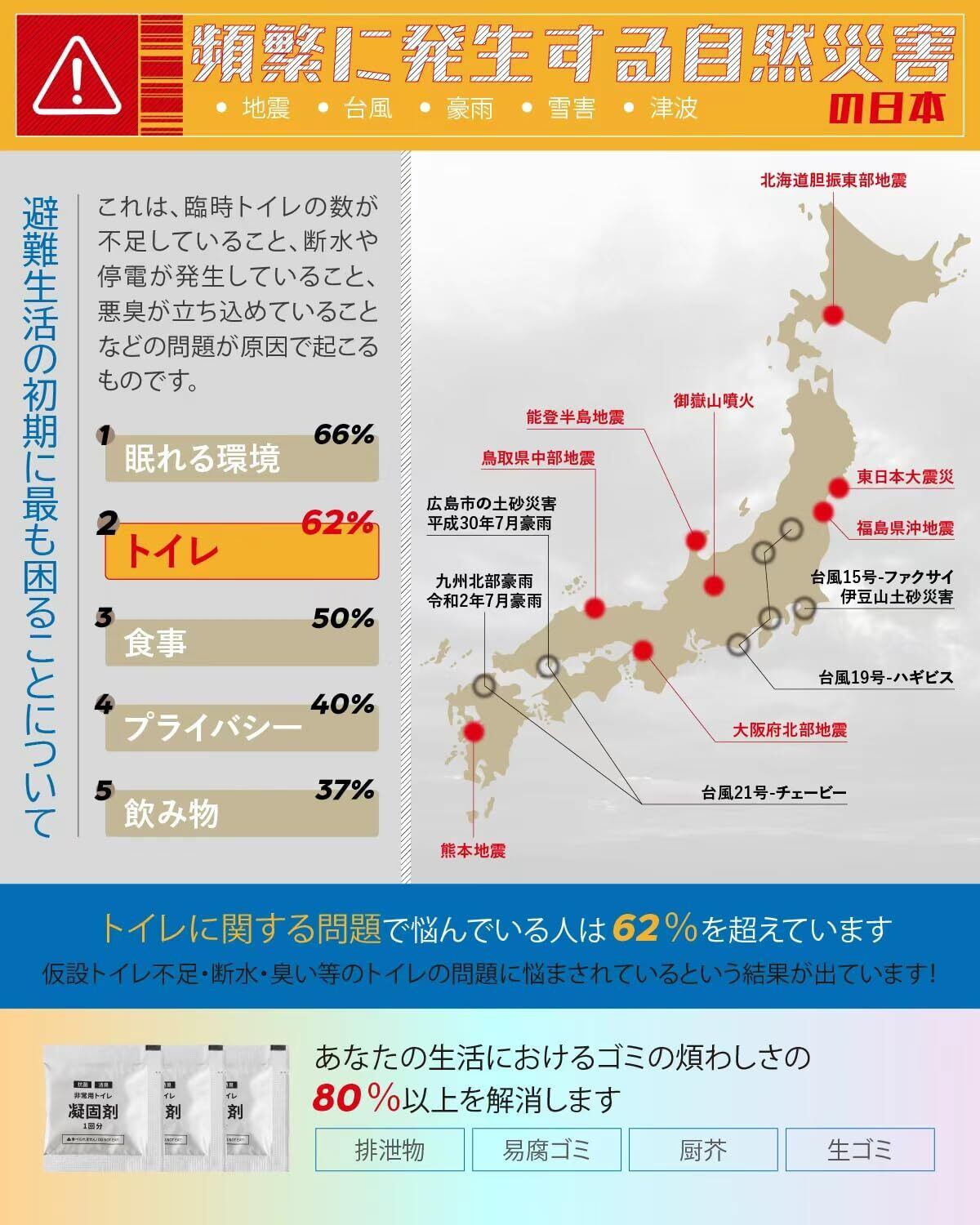 【トイレ凝固剤×高吸水性樹脂|3ステップ直感的操作】 ①便器に袋設置 ②凝固剤を均等散布 ③固化後に密封廃棄。環境配慮型素材|廃棄時も土中分解可能。