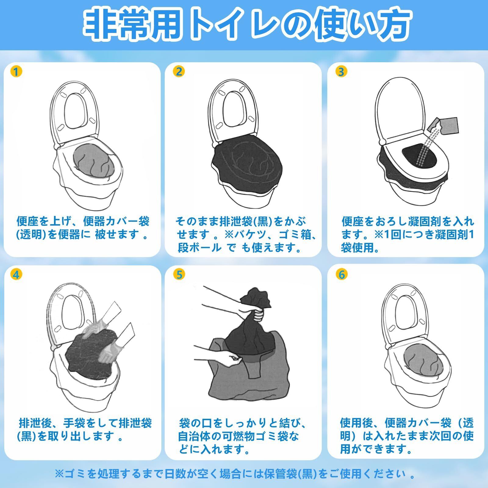 【防災グッズセットの必需品!水の要らない*簡単便利な防災トイレ】取付はたったの20秒、専用の便座カバー、排泄用袋を便座にかぶせて用を足し、終えたら凝固剤を入れるだけ!50組の使い捨て手袋が付いているので、清潔で衛生的で、安心して使用できます。突然の断水の心配もなく、安心して使うことができます。