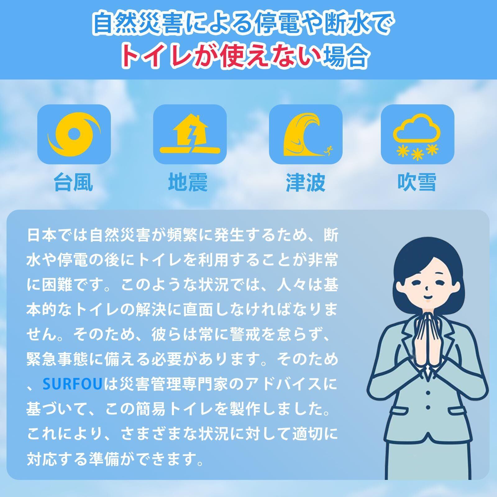 SURFOU 簡易トイレ 携帯トイレ 災害用 非常用 50回 【防災士監修】 災害グッズ 凝固剤付き 使い捨て 消臭抗菌 清潔衛生 地震 断水 緊急用/キャンプテント用/車内用/介護用 防災グッズセット 15年保存