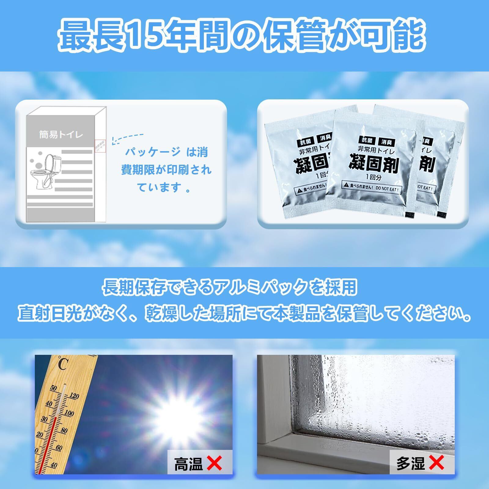 【15年長期保存可能な簡易トイレ】凝固剤には劣化しにくいアルミ製のパッケージを採用することで長期保管を可能にしました。A4サイズで省スペース設計!箱のまま本棚やトイレ棚に保管てき、ご家庭または企業や自治体の方にも最適です。自然災害の多い地域で使用できるように設計されており、突然の自動断水にも簡単に対応できます。