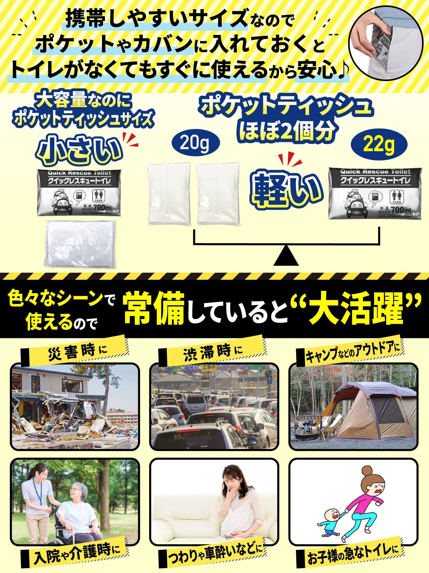 ・【携帯に便利で様々なシーンでも開けてすぐに使える】クイックレスキュートイレは 携帯に便利 な 携帯トイレ です。ポケットティッシュ程のコンパクトサイズで重さもポケットティッシュ2個分程と超軽量なので、ポケットやカバンに入れて持ち運びしやすく、トイレがなくても開けてすぐにご使用できます。そのため、 災害 時はもちろん、 渋滞 時や キャンプ などの アウトドア 、 妊娠中 や 車酔い などの 気分不良時 、 介護 や入院時 、 お子様の急なトイレ など様々なシーンでも使える便利な 防災グッズ です。