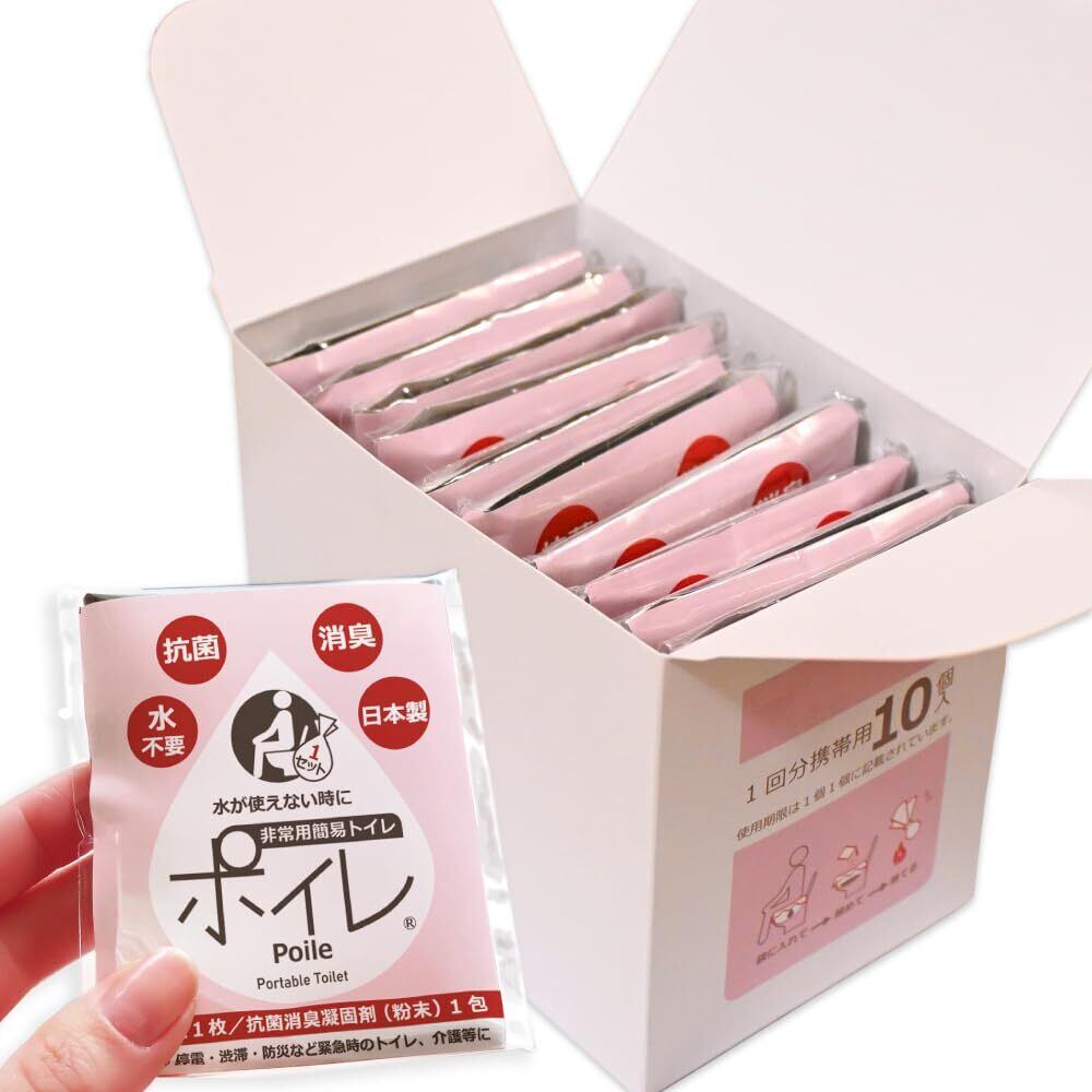 【 内容・サイズ 】 [個包装携帯トイレ1回分セット] ・抗菌性凝固剤「ポイレかた丸」×1包(高吸水性ポリマー)・排便袋(黒)×1枚(ポリエチレン製/650mm×480mm)・使用方法・使用期限はパッケージ裏面に記載 ※凝固剤は粉末です。<1個あたりの外寸:約75×90×10mm>コンパクトで保管しやすく、防災バッグやリュックにも無理なく収まります。<10個入り箱 外寸:約110×75×87mm>