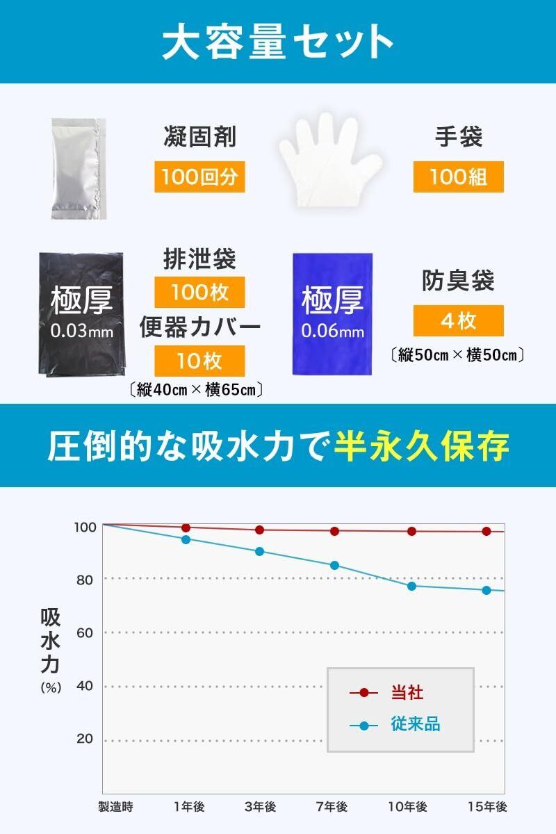 【 セット内容 】 凝固剤100個、排泄袋110枚、手袋100組、防臭・抗菌、目安として15年保存としておりますが"半永久的"に保存可能です。 100回分:高さ16cm×横23cm×奥行19cm、トイレの棚に収まるコンパクト設計。 100個入りでも場所を取らず収納出来るから備蓄に最適です。 凝固剤を尿に振りかければ30秒で固まります◎ .