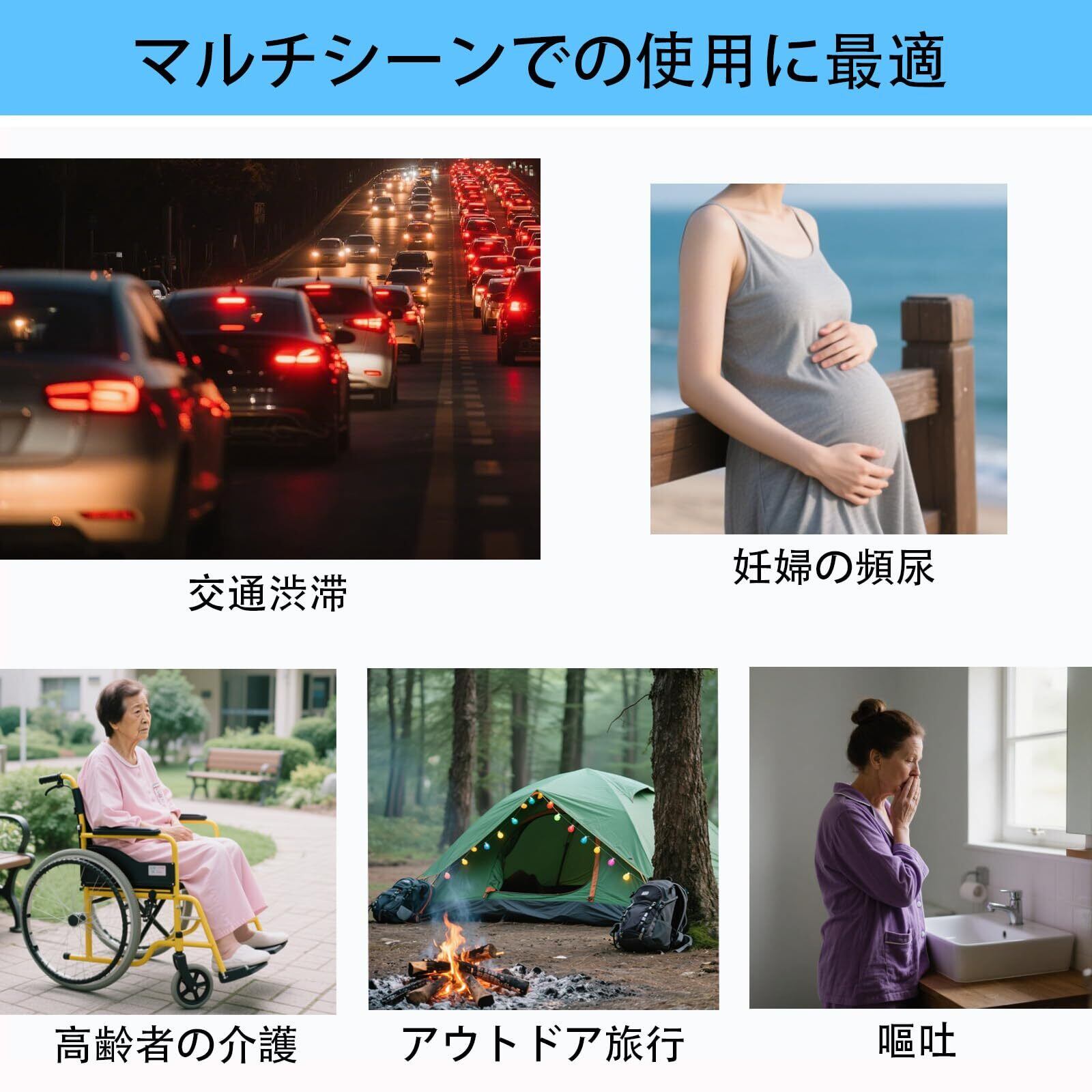 【車内・屋外など幅広いシーンに対応】 キャンプ・登山・釣りなどのアウトドアはもちろん、携帯トイレ 車用として渋滞時や長距離ドライブにも活躍。旅行や災害時、移動中の緊急対策にも最適です。