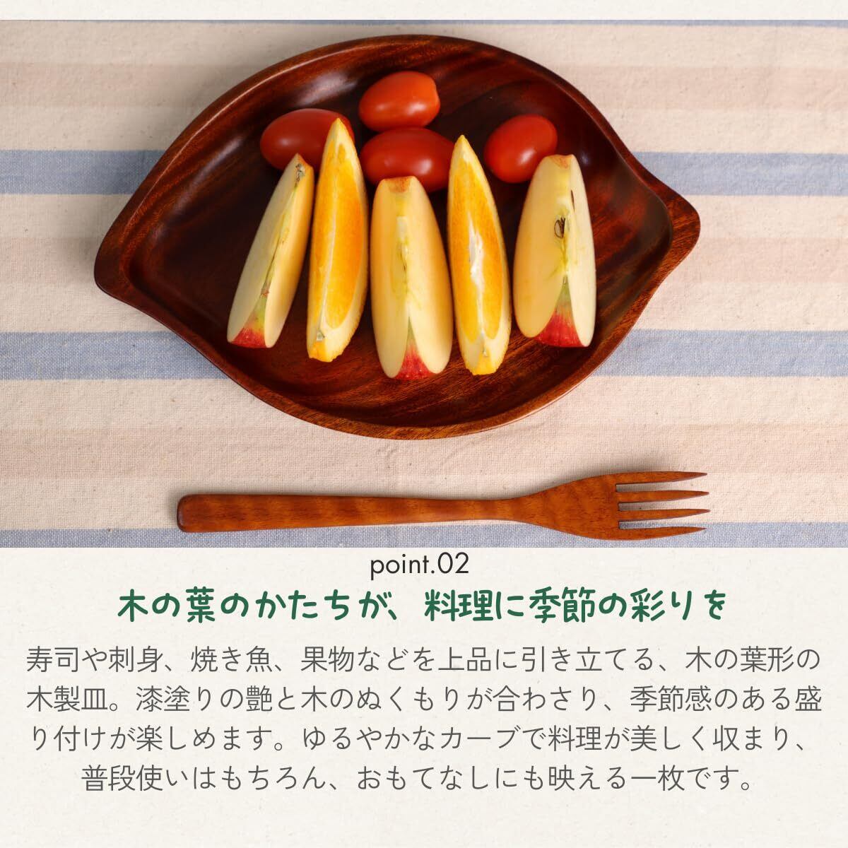 【 木の葉形デザインが生み出す上品さ 】長さ24×17cmの程よいサイズ感と、流れるような木の葉のフォルムが特徴。洗練されたデザインが、刺身や焼き魚、揚げ物、寿司などの盛り付けを格上げし、料理をより美しく演出します。