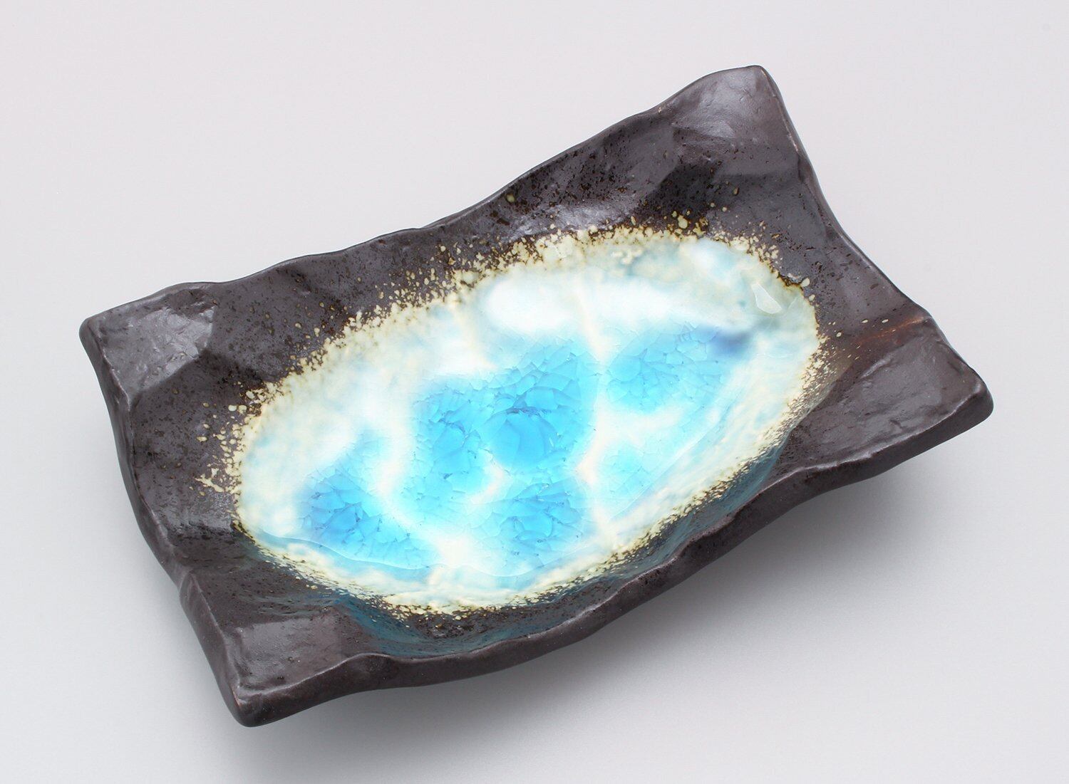 貫入の入ったガラス質の青い釉薬が個性的な変形鉢。