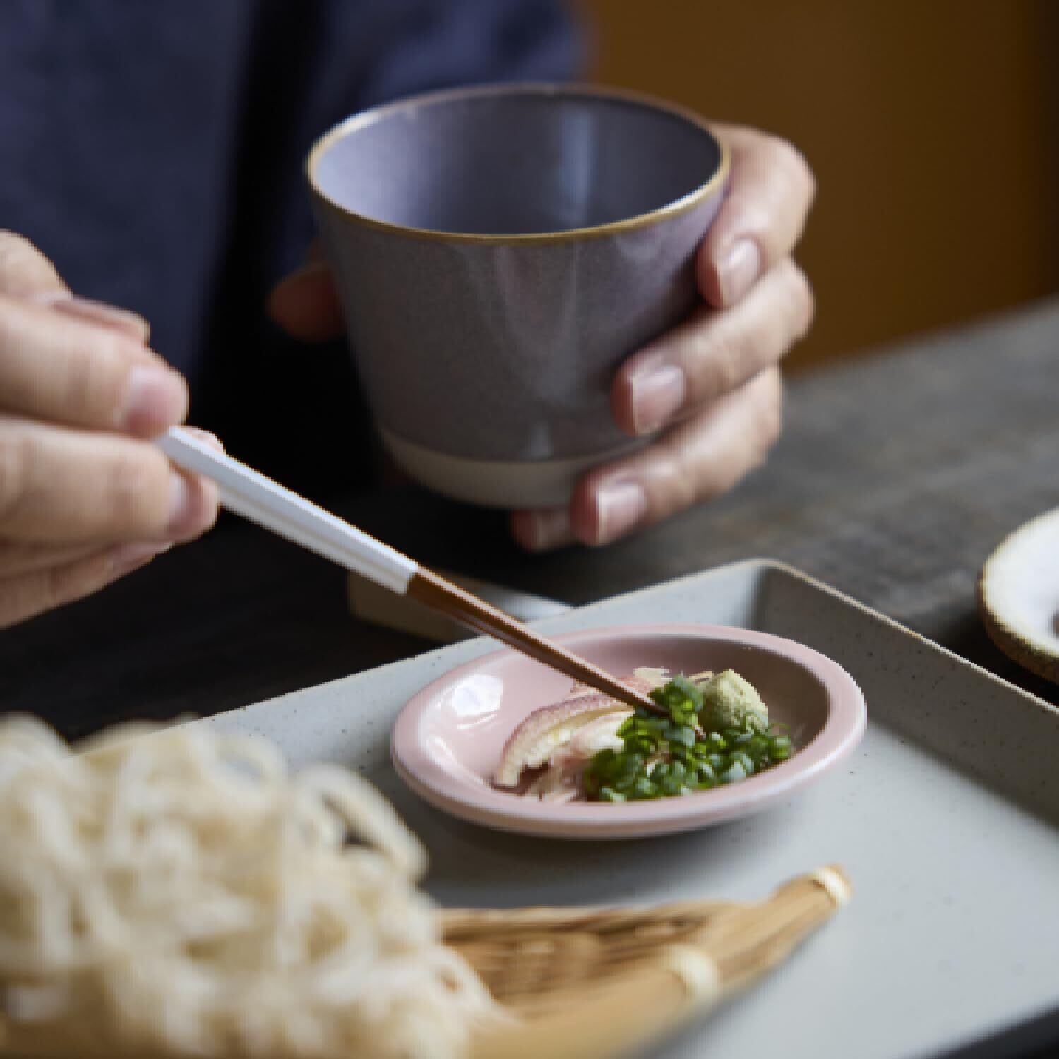 蕎麦徳利にお猪口、薬味皿。 蕎麦の膳を彩るうつわに現代のセンスをミックスした「Kuon(クオン)」。 小粋な色使いのシリーズ、削ぎの美しさが映えるシリーズ、さらに、ほっこりと丸みを帯びた3つの個性が揃いました。