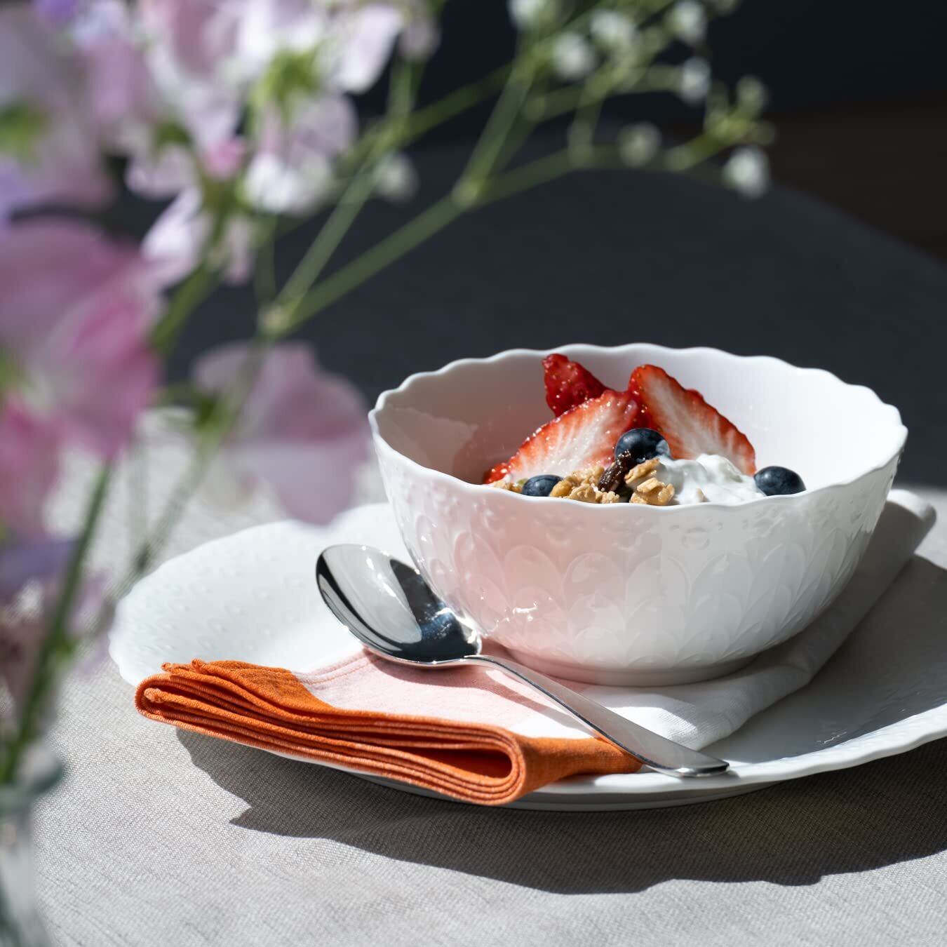 1977年発売以来のロングセラー。野に咲く小花の優美な曲線をイメージしたレリーフと優しく手に馴染む形が魅力の「食卓の白い宝石」です。ボーンチャイナの美しさを最大限に活かしたシルキーホワイトは、グッドデザイン賞・ロングライフデザイン賞を受賞。日常使いに最適な器です。