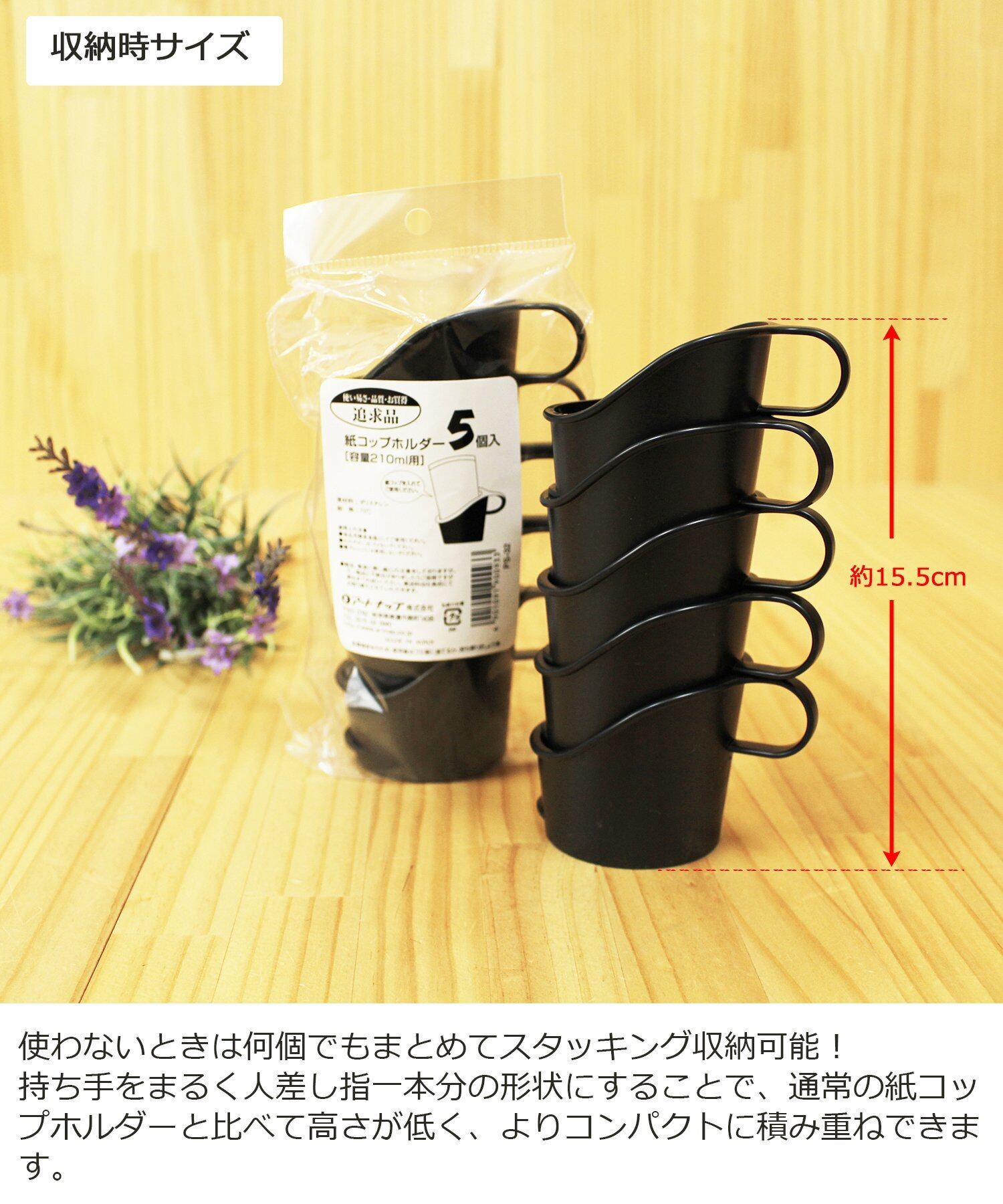 ●持ち手をまるく人差し指一本分の形状にすることで、通常の紙コップホルダーと比べて高さが低く、よりコンパクトに積み重ねできる
