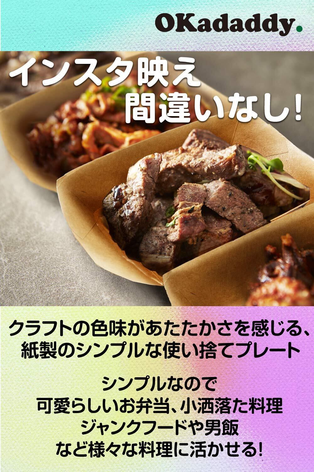 【 環境と財布に優しい 】 使い捨てのプレートは、業務用のイメージがありますが、家庭で使用するにも便利です。普段使いのお皿にすれば、面倒な洗い物が減り、気分によって使い分けることもできます。また、大人数で食事を囲む、運動会やピクニックにも便利なアイテムです。「OKADADDY」製の使い捨てプレートは、厚手で高品質なクラフト紙仕様となっております。耐油性と防水性がありますので焼物皿にぴったりなアイテムとなっております!50枚セットと大容量なため、大人数のパーティーやBBOなどにご活用下さいませ 【 注意点 】重量計算のため、枚数に若干の前後差が御座います。予めご了承ください。