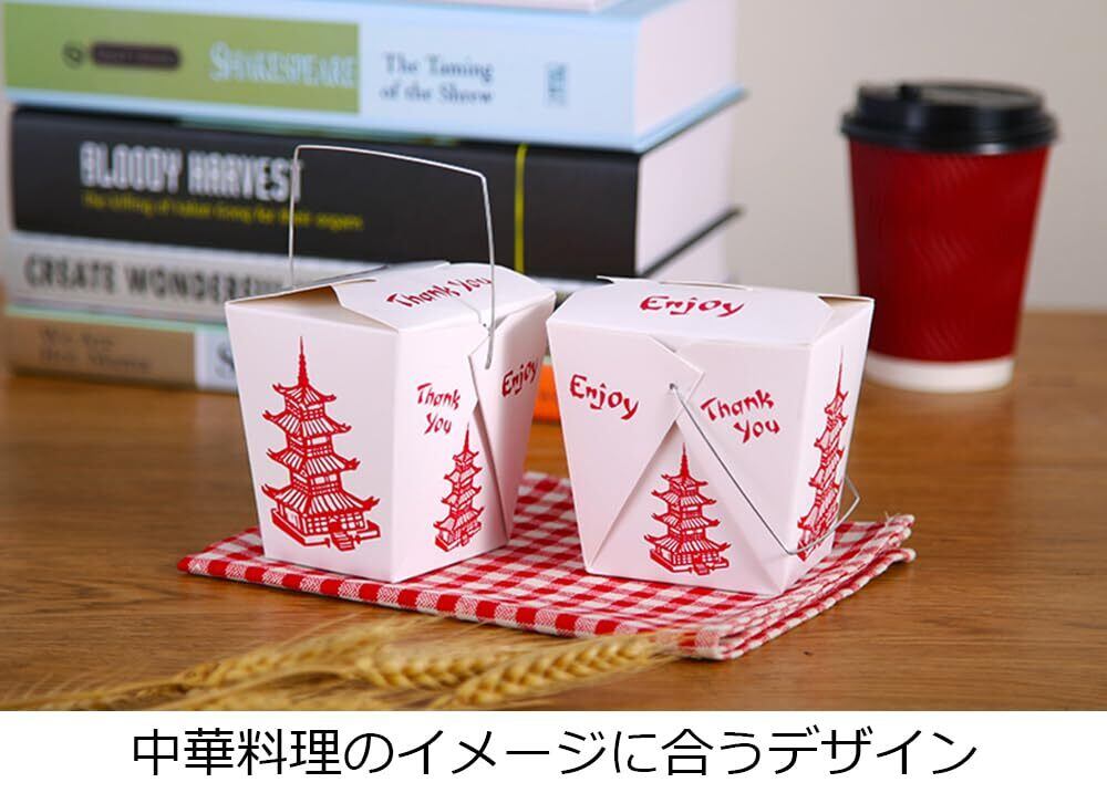 持ち手つきチャイニーズプリント紙製容器。中華料理に合うデザインで焼きそばや炒飯など、一品料理のお持ち帰りに最適です。