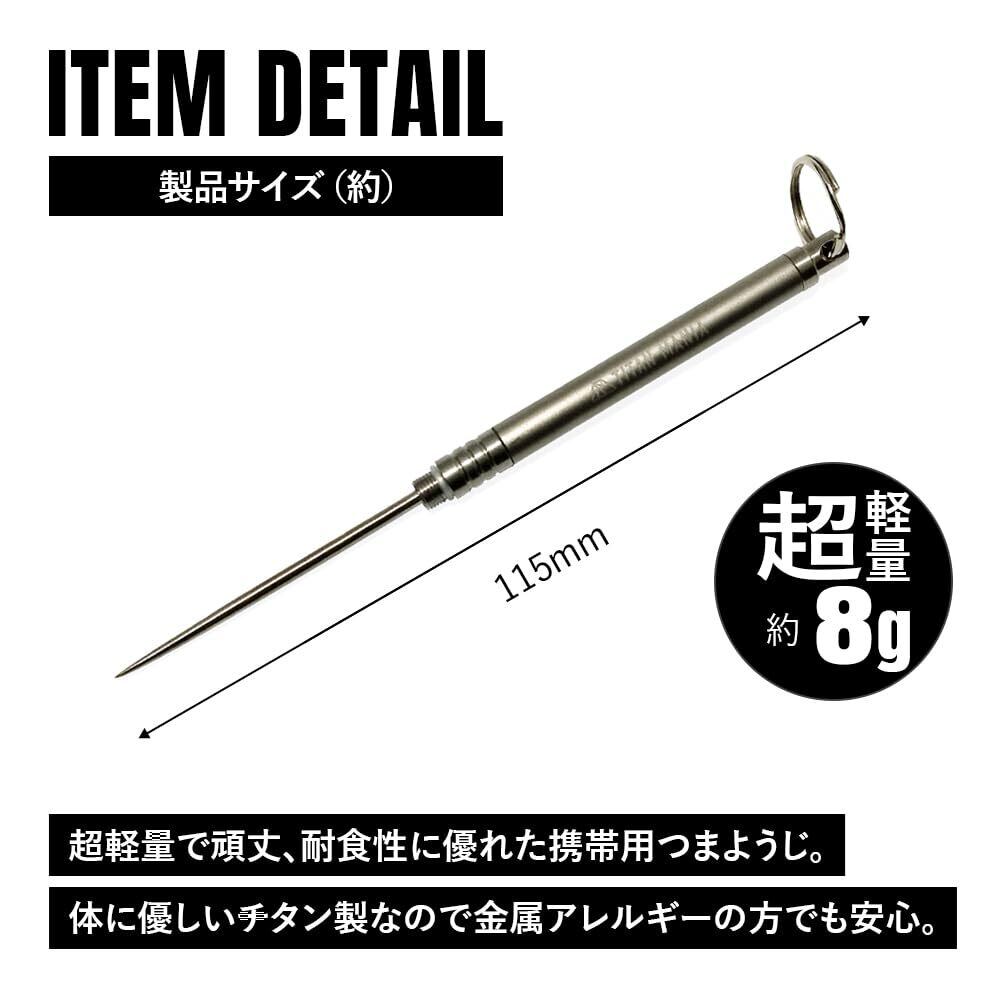 【商品説明】 超軽量で頑丈、錆びにくいチタン製携帯用つまようじ。キャンプやアウトドアはもちろんビジネスシーンでの会合や外食など日常的な使用はもちろんファッションアイテムとしても◎ 医療用途にも使われるチタン製で、磁気を帯びる心配や金属アレルギーの方でも安心してご使用いただけます。